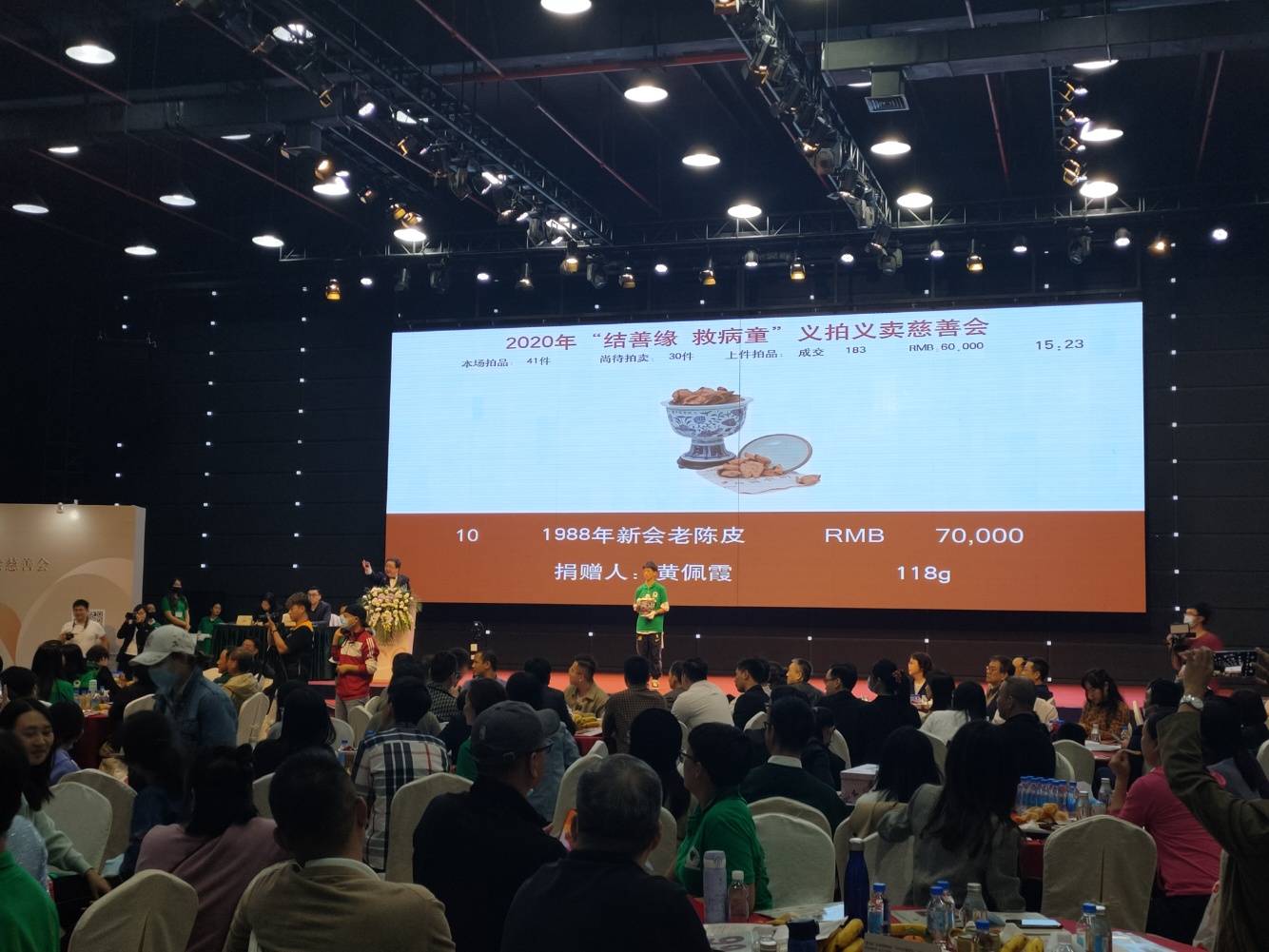 40件拍品被成功拍出,多数义卖品被抢购一空。尽管疫情严控,但仍有400余位善心人士及爱心企业前来赴这一年一度的爱心之约,40件来自名人名家的艺术品和收藏品全部成功拍出。连续3年捐赠了新会老陈皮的江门市新会区柑满园食品公司创始人、广东新会陈皮协会副会长黄佩霞女士今年又捐出一件陈化32年的118克珍贵老陈皮,得到各位爱心人士的踊跃举拍,最终拍得7万元的全场最高价。
