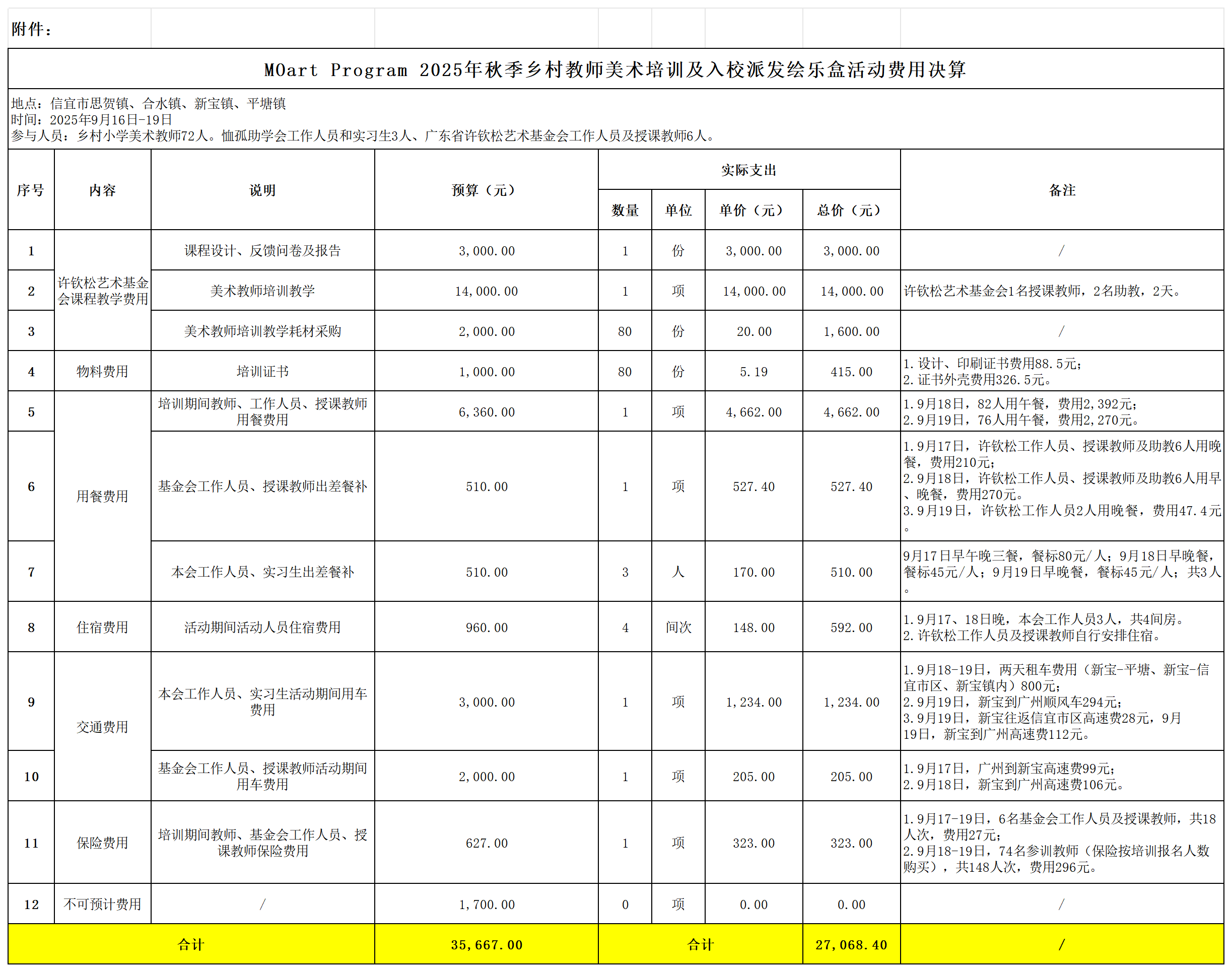 广东公益恤孤助学促进会(以下简称本会)MOart Program(以下简称项目)致力于改善乡村学校美术教育环境,支持乡村美术教师成长,助力乡村学生实现艺术梦想。为推动过往项目内容和支持方式的优化升级,带来更扎实的美育发展成效,2025年,项目再次为信宜市新宝镇、思贺镇、合水镇、平塘镇8,857名师生送去了承载艺术梦想的MOart绘乐盒,并为72名信宜市乡村美术教师开展了美术培训活动等。 活动由本会与信宜市新宝镇、思贺镇、合水镇、平塘镇中心学校联合主办,EPO时尚集团与广东省许钦松艺术基金会鼎力支持,新宝镇中心小学提供场地保障。多方力量汇聚,共同为乡村美术教育发展注入新动能,助力2025年秋季乡村教师美术培训与入校派发绘乐盒活动顺利完成。 (一)美术教师培训 9月18-19日,项目联合广东省许钦松艺术基金会专家团队,特邀高中美术正高级教师、广东省特级教师、中国少儿版画研究会常务副会长刘磊老师担任主讲,为信宜市乡村美术教师提供为期两天的专业培训。“MOart绘乐盒(初阶)使用培训”由本会工作人员面向未曾参与过此主题学习的乡村美术教师开展。 (二)绘乐盒派发 与此同时,MOart绘乐盒也如期而至。为了让乡村孩子们能在新学年的美术课及时用上绘乐盒,8,857个绘乐盒在9月上旬已全部运送到各镇项目校。 9月16-19日,本会工作人员与四镇中心学校项目对接人一同,分别前往合水镇第一小学、思贺镇中心小学、新宝镇中心小学和平塘镇中心小学,为8个班级的学生现场派发绘乐盒,通过互动提问、PPT介绍等方式,帮助学生直观了解新一年MOart绘乐盒的变化,邀请学生在作品集中发现自己或同学的作品,并鼓励孩子们勇敢创作、积极参与项目的各项活动。 (一)调研报告 为了解本次活动成效,在教师培训活动结束之后,许钦松艺术基金会对回收的教师反馈问卷进行了内容分析和数据汇总,得出《乡村学校艺术教育项目2025年秋季乡村教师美术培训反馈报告》。调研报告数据显示:本次培训教师整体满意度较高,平均分值为4.84(评分采用1-5分制),98%的教师给本次培训打出4分及以上的高分。 通过培训,教师掌握了版画制作的具体技术细节,在教学理念、技能应用和职业认知上均有提升。理论学习方面,85%的教师认识到“生活处处是艺术”,美育的重要性远超技法传授,日常教学也可融入乡土文化。实践应用方面,90%的教师学会了如何用身边的材料和专业技法制作出色的版画作品。部分教师还开始探索多样化教学模式,例如提出可以将版画技法融入美术课教学等创新实践思路,还提出跨学科融合案例,认为此次培训所教授的方法对其他学科教学亦有启发。 (二)教师培训课堂反馈 本次课程注重“动手实操”,让参训教师在亲身实践中体会版画创作的多样技法与内外关联,帮助乡村教师在参与创作的过程中,有效提升美术教学能力。培训第一天上午,刘磊老师结合乡村教学的实际,以风趣幽默的教学风格,与参训教师分享了版画创作的基础理论,探讨了有限资源条件下的版画课程应用与实施策略。接下来的一天半培训中,刘磊老师及两位助教老师采用示范教学与实操相结合的方式,使版画的抽象概念和原理,在教师们刻画作品、研磨墨浆、推压滚筒的过程中,变得具体且可操作,同时,沉浸式的创作也让教师们在培训中获得了更多有关美育的灵感。 “这次的活动让我充分体验了版画创作,感觉2天时间很充实、培训很到位,我们通过动手操作,能够更直观地体会到作品是如何诞生的,认识到创作的过程中哪些地方需要注意和改善,只有这样,我们才能明白如何带领学生体验这些美术课程。”“我是这个学期才开始任教美术的,这次的培训课程增强了我开展美术教学的信心,老师给了我很多启发,例如信宜这边有很多竹子,我之后也想试着结合当地的自然特色,带领学生们一起创作。”参训教师的反馈表明,此次培训不仅帮助教师们重拾了对乡村美术教育的信心,更激发了ta们对艺术创作的兴趣与热情。 (三)学生反馈 9月16-19日,本会工作人员先后前往四所项目校,为8个班级的学生现场派发绘乐盒。活动现场,乡村学生们“沉浸式”地探索着绘乐盒中的奥秘:有的兴致勃勃地翻阅起最新一年的作品集,有的爱不释手地捧着色彩缤纷的黏土,有的迫不及待地拿出水彩笔开始涂画…… “好像橙色盒子上的英文字有点不一样啦!”“今年的水彩笔变成了18个颜色!”“黏土和彩纸也变多了!”……孩子们争先恐后、欣喜雀跃地分享着新一年绘乐盒的变化,ta们对于艺术创造的兴趣与灵感,随着MOart绘乐盒的到来,再一次被点燃。 (四)媒体传播 本次活动通过多渠道发布信息和开展宣传,截至2025年10月8日,在本会公众号发布了2篇推文,在MOart服务号发布了1篇推文,并在爱童行视频号、MOart抖音号发布了活动相关短视频,累计吸引了511人次用户浏览。此外,在今日头条发布了1篇新闻报道。此次传播展现了本次乡村教师培训及绘乐盒派发活动的情况,反映出乡村师生在活动过程中的成长与收获,以及开展美育对当地的积极影响。 (一)完善活动入场与签到流程,提升参与体验。 本次活动整体流程顺畅,教师参与积极。在签到与物料发放环节,为更高效地服务参与教师,可进一步优化流程设计与现场引导,以提升活动开场的整体体验。改进建议如下: 1、提前发布领取通知。 在活动开始前,通过沟通群
