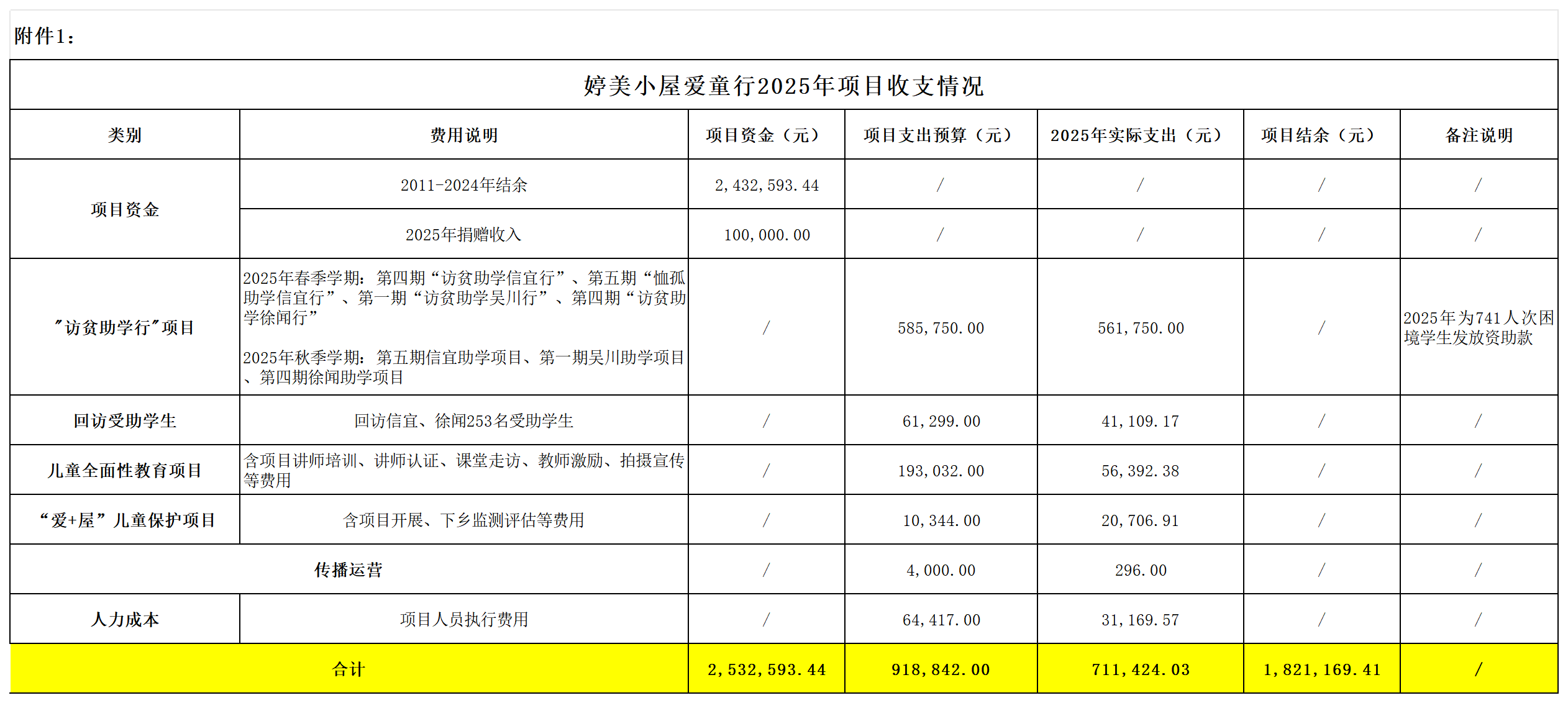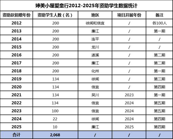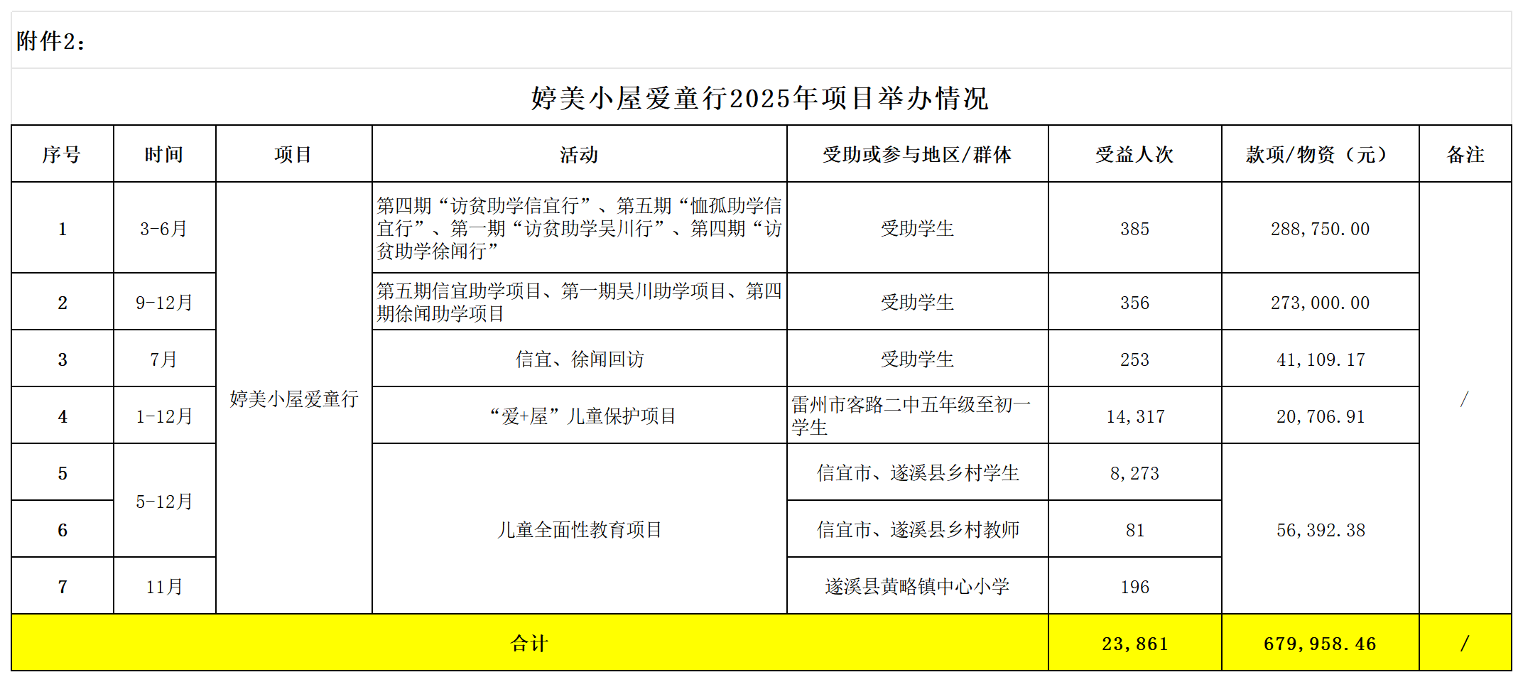 一、项目概况 2025年,广东公益恤孤助学促进会婷美小屋爱童行(下称婷美小屋爱童行)不仅在经济方面资助乡村困境学生,还从身心方面支持、陪伴乡村儿童青少年的健康成长。 婷美小屋爱童行2025年捐赠收入10万元,其中4.5万元用于“访贫助学行”项目资助10名困境学生,5.5万元用于成长关怀项目。在2025年项目年度方案的规划下,为第四期“访贫助学信宜行”、第五期“恤孤助学信宜行”、第一期“访贫助学吴川行”、第四期“访贫助学徐闻行”项目的受助学生发放资助款561,750元;儿童全面性教育项目为信宜、遂溪共81名讲师提供性教育课程培训,截至2025年12月31日,两地2025年性教育讲师授课178节,服务学生8,273人次,开展性教育主题嘉年华活动服务学生196人次;“爱+屋”儿童保护项目于2025年5月完成结项工作,五年以来共开展317场主题活动,服务儿童、家长及老师86,104人次。 二、项目内容 (一)“访贫助学行”项目 1.资助工作 (1)2025年8月26日,第四期“访贫助学廉江行”项目协调会在湛江廉江市举行,恤孤助学会与廉江市妇联签订《资助廉江市困境学生协议》,启动2025年第三个助学项目。2025年12月1日,确定资助第四期廉江助学项目困境学生674名。其中,婷美小屋爱童行2025年助学捐款4.5万元用于第四期廉江行助学项目,按每名学生4,500元的资助标准计算,对口资助廉江市10名困境学生,资助款预计于2026年春季学期开始发放。 (2)2025年资助款发放情况如下: 2025年春季学期,为第四期“访贫助学信宜行”、第五期“恤孤助学信宜行”、第一期“访贫助学吴川行”、第四期“访贫助学徐闻行”项目的385名困境学生共发放资助款288,750元。其中,1名第四期信宜助学项目的受助学生的4,500元资助款发放完毕,结束资助;第五期信宜助学项目、第一期吴川助学项目共有5名学生因辍学、自愿放弃等原因停止资助;经信宜市、吴川市妇联提交替补学生资料,由恤孤助学会复核后,信宜市新增替补学生3名、吴川市新增替补学生4名。 2025年秋季学期,为第五期信宜助学项目、第一期吴川助学项目、第四期徐闻助学项目的356名困境学生共发放资助款273,000元。其中,第五期信宜助学项目、第一期吴川助学项目、第四期徐闻助学项目共30名学生因辍学、升读职校、自愿放弃等原因停止资助;吴川市有4名学生升读大学,一次性发放剩余资助款;截至2025年12月31日,信宜市、吴川市、徐闻县秋季学期替补学生资料仍在收集中,资助款将于2026年发放。 2025年合计为741人次困境学生发放561,750元。 2.回访学生 2024年3月、10月,婷美小屋爱童行对口资助256名(信宜234名、徐闻22名)学生,按每名学生4,500元的资助标准计算,合计资助款项为115.2万元。截至2025年6月,有253名学生(信宜231名、徐闻22名)在资助期内。 2025年7月12-13日,婷美小屋爱童行组织35名经专项培训的志愿者对信宜市231名在资助期内的受助学生进行入户探访并发放爱心包物资。徐闻县22名学生不安排入户探访,将22份爱心包物资寄送给徐闻县下桥镇妇联,请其代为发放给受助学生。 入户探访中,志愿者通过问卷的方式,了解学生们的情绪、苦恼及现状。除此之外,还为受助学生准备了专属的爱心包,爱心包中含有4本适龄的课外书籍、1份学习用品、1份生活用品、1份适龄玩具。希望受助学生可以借助学习用品及课外书籍增强对阅读的兴趣,提升写作能力;通过适龄玩具多结交好友,拉近与朋辈群体之间的距离,拓宽社交范围。 3.书信往来 7月初,收到湛江市遂溪县城月镇一名即将步入大学的受助学生来信,信件中诉说了当前生活的现状,以及在升学压力下面临的矛盾与苦恼。项目团队工作人员阅读完信件后,给予了回信,为受助学生答疑解惑、提供鼓励和支持,希望这封回信能给予她一些力量去面对生活的选择与困难。 ✦ • ✦ (二)儿童全面性教育项目 2025年是儿童全面性教育项目开展的第四年,由恤孤助学会与信宜市妇联、遂溪县妇联联合主办,深圳市你我伙伴教育科技有限公司(下称你我伙伴)为项目提供技术支持,在信宜市、遂溪县分别选拔并培训了33名和53名性教育讲师,最终共有81名讲师通过考核,成为2025年性教育讲师。2025年儿童全面性教育项目惠及信宜市、遂溪县师生8,550人次。 2025年4月初,项目在信宜市、遂溪县同时启动,信宜市妇联、遂溪县妇联在各镇街招募优秀人才,组建性教育项目讲师团队。5月23-24日,在信宜市职业技术学校开展信宜市项目启动会暨讲师培训,为团队的33名讲师提供了为期2天的培训。5月26-27日,在遂溪县委党校举行遂溪县项目启动会暨讲师培训,为团队的53名讲师提供为期2天的培训。两地的培训在你我伙伴培训师的带领下,围绕青春期生理心理变化、性别平等、性暴力预防、网络社交安全等八大核心主题系统学习性教育知识,同时结合理论讲解、案例分析、情景模拟及实操演练等多元形式,强化讲师的知识与技能储备。 经师资培训后,信宜有30名参训讲师通过性教育讲师初级认证,遂溪县有51名参训讲师通过性教育讲师初级认证。获得认证的讲师陆续在2025年走进乡村学校、社区进行授课,在此过程中,讲师不仅提升了自身的教学能力,也见证了学生们的变化与成长。有部分讲师在授课前后让上课的学生填写前测、后测问卷,通过对比前后测问卷填写情况,自查授课质量,了解学生掌握性教育知识的程度。除此之外,还日常跟