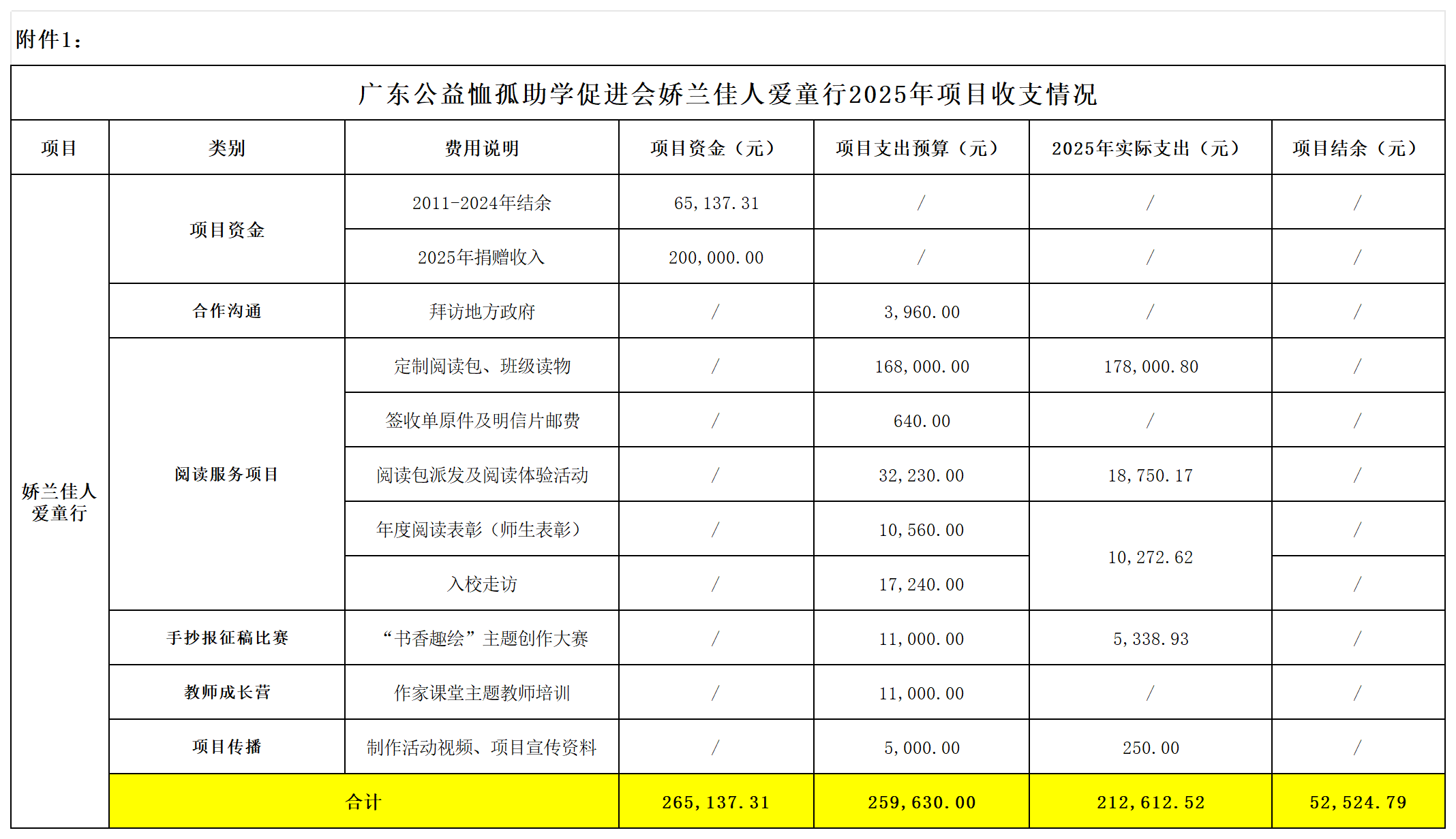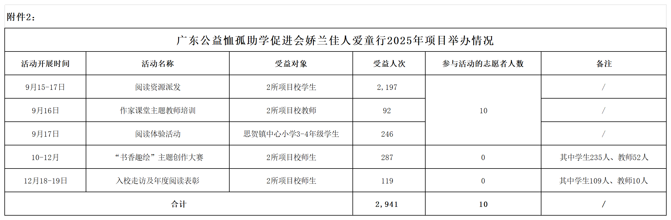 一、项目概况 广东公益恤孤助学促进会娇兰佳人爱童行2025年捐赠收入25万元,其中管理费用为5万元。项目业务活动成本支出约21.26万元,截至2025年12月31日项目业务活动成本余款约5.25万元。 2025年,娇兰佳人爱童行启动GIALEN BOOK童学会乡村儿童阅读服务项目,通过向儿童派发装有优秀儿童读物及辅助学习用品的阅读包,活动培养儿童的阅读兴趣,提高儿童的阅读质量,致力于改善经济欠发达地区儿童的阅读资源与环境。 二、项目内容 2025年,娇兰佳人爱童行为项目校学生派发 2,197 份“好好”阅读包及适龄的班级读物,并开展阅读包派发活动、阅读游园会、作家课堂主题教师培训、“书香趣绘”主题创作大赛、“阅读之星”评选、入校走访及年度阅读表彰等活动,激发学生的阅读兴趣,提升教师的阅读技巧和教学能力,营造校园浓厚的阅读氛围。 2025年项目共惠及2,941人次,现对项目内容总结如下。 (一)定制阅读资源 1.定制“好好”阅读包 项目自主定制“好好”阅读包,一份阅读包内含3本儿童书籍、1本阅读手册、3个书套、2张贴纸书签和 1张明信片。 每个“好好”阅读包内的3本书籍均按统一标准搭配,具体可分为A、B、C三类:其中A类按高、中、低年级分别对应绘本、故事书及文学类作品;B类为益智类书籍;C类书籍则涵盖生存安全、思想品德培养及情绪管理类书籍,满足儿童多元化需求。 同一班级的学生获得“好好”阅读包中的图书各不相同,孩子们可以根据个人兴趣,与同学交换,并在万卷计划手册上记录借阅书籍的信息及阅读感悟。 2.定制班级读物 除“好好”阅读包外,结合各年龄段特点和小学课外阅读需求,为各项目校的每个班级配备班级读物,并放置在教室读书角供学生自主阅读,或是在教师的带领下开展共读。 每个班级按指定书目需求配备3套“快乐读书吧”班级读物(2套秋季学期,1套春季学期);1-2年级的学生正处于英语学习的成长阶段,这一阶段需要通过大量输入和趣味互动,为后续英语的听说读写能力的全面发展打下基础。因此,为1-2年级每个班级额外定制2套英语启蒙绘本。 (二)阅读资源派发及系列阅读活动 1.阅读资源派发 9月16-17日,项目团队来到合水镇第一小学、思贺中心小学为2,197名学生派发“好好”阅读包,并安排班级代表领取配套的班级读物,两地中心学校、项目校领导出席了派发活动。 除此之外,项目团队前往合水镇第一小学的两个班级,为学生播放“好好”阅读包使用视频,面对面介绍阅读包及内容物,让学生们了解“好好”阅读包及阅读辅助工具的使用方法,充分使用阅读资源,提升自身的综合能力。 2.阅读体验活动 9月17日,组织志愿者前往思贺中心小学,为246名三、四年级学生开展了阅读主题游园会,以阅读为主题设置了10个摊位,包括认识甲骨文、蹴鞠大赛、疯狂造句、大家来找茬、趣味拼字、我来吟诗一句、猜谜接力跑、数字炸弹、活字印刷及奖品兑换摊位,让“阅读”与“互动”融合,让阅读从静态的文字吸收变成动态的沉浸式体验,同时帮助孩子们在体验中加深对内容的理解与记忆,实现“在玩中读,在读中悟”。 3.阅读交换 10-12月,由各项目校根据学年阅读计划及安排,组织学生进行班级阅读交换活动,并在项目校沟通群反馈活动照片、活动感想。如合水镇第一小学开展完阅读课后,鼓励学生介绍自己的书籍、分享读书心得,让大家初步了解书籍的内容,促进书籍在同学之间交换与流动;思贺中心小学则利用早读、自习课开展阅读交换活动。 4.“阅读之星”评选 12月,由两地项目校的教师们根据学生们的阅读频率、万卷计划手册填写情况,以及每个年级约4%的占比名额,选出共109名学生“阅读之星”榜样。 5.“书香趣绘”主题创作大赛 10-12月,为鼓励学生继续保持阅读的热情,积累书中的知识,分享阅读感受,在2所项目校开展“书香趣绘”主题创作大赛,聚焦“认识字母”“好阅读”两个主题征集作品,最终通过预评选和网络评选选出获奖作品。 11月中旬,比赛征集到235份创意作品,经广东作家协会会员、美术专业志愿者组成的评委团,对参赛作品开展首轮评选,选出188份作品进入网络投票阶段。 12月10日,188份预评选作品通过网络投票的形式,根据不同创作主题和总票数排序情况,共有60份作品获奖。主题“认识字母”中,10份作品获优秀奖,10份作品获创意奖;主题“好阅读”中,10份作品获一等奖,10份作品获二等奖,20份作品获三等奖。与此同时,32名在大赛中悉心指导学生创作的教师,获得优秀指导教师称号。此次活动共吸引287名师生参与。 6.作家课堂主题教师培训 9月16日,邀请国家一级作家赵小敏老师为2所项目校教师开展“作家课堂”主题活动。活动以“阅读开启未来”为主题,让乡村教师打破对于阅读的固有认知,掌握正确的阅读方法,将所学知识和技能应用于实际教学中,鼓励教师设计和开展更加符合学生需求的阅读活动。 此次活动共吸引92名项目校教师参与,不少教师表示,这是一次非常精彩有趣的课堂,希望有机会还能参加。活动结束后,为每一位参与活动的项目校教师发放“好好阅读便签墙”墙纸,让教师粘贴到班级黑板的空白处,引导学生在便签墙上粘贴书籍读后感、阅读启发等,对阅读完的书籍进行有益的输出。 (三)入校走访及年度阅读表彰 1.入校走访 12月18-19日,项目团队分别来到思贺中心小学、合水镇第一小学,通