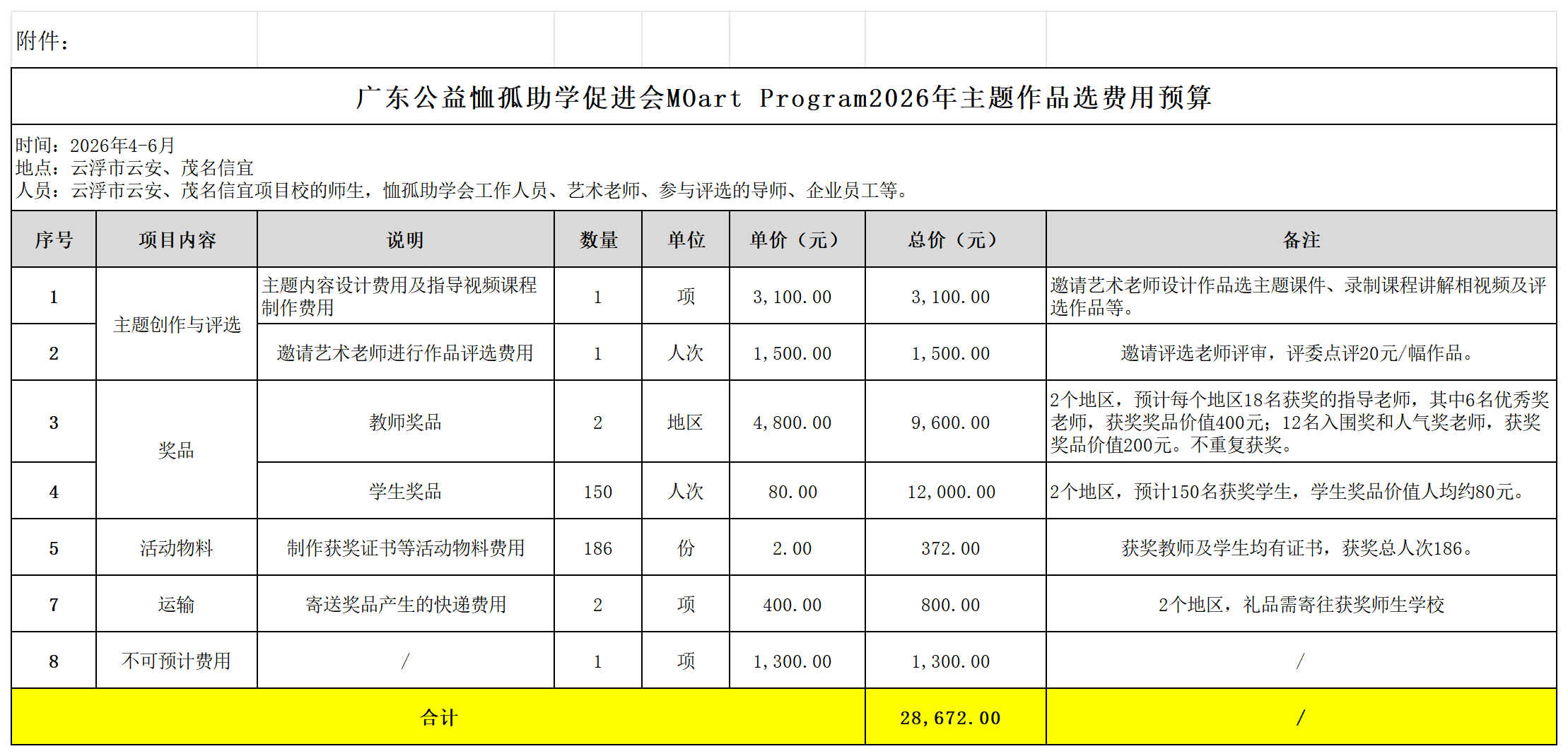 一、活动背景 广东公益恤孤助学促进会爱童行专项基金开展乡村学校艺术教育项目MOart Program(下称项目),通过开展主题作品选、艺术夏令营、未来艺术家筑梦计划、支持乡村学校美术教师成长等活动,推动艺术教育在乡村学校的开展和普及。 2025年向信宜市4个乡镇的乡村学校师生发放了8,857份MOart绘乐盒,同时为乡村小学美术教师提供绘乐盒课程培训。2017-2025年,项目已举办九届主题作品选,并邀请创作出优秀作品的学生及指导学生作品的美术教师参加夏令营,同时选拔出24位对艺术感兴趣且具有艺术天赋的学生加入“未来艺术家筑梦计划”(经每年考核及确认参与意愿后,目前有8名学生签订培养承诺书并接受培养)。2026年,项目计划在信宜市和云浮市两地举办第十届主题作品选,征集并筛选优秀作品,选拔天赋学生参加“未来艺术家筑梦计划”。 二、活动目的 主题作品选意在为乡村学生搭建一个展示艺术才华的平台,通过专业、公正的评选机制,筛选优秀作品及其创作者,获奖学生及指导教师将有机会参加MOart夏令营;同时,发掘对艺术感兴趣且有艺术天赋的学生,加入“未来艺术家筑梦计划”,并为其提供持续的培养与支持。 (一)激发创作热情 通过评选活动激发学生对艺术的热爱与表达欲,激励更多学生参与艺术创作,在实践中培养审美能力与创新思维,让艺术成为表达自我的重要方式。 (二)助力校园美育建设 提升美术教师教学积极性,助推校园艺术活动常态化开展,营造浓厚的美育氛围,助力构建充满活力的校园美育生态。 (三)点亮艺术梦想 发掘具有艺术天赋的乡村学生,为其提供更多样化的活动参与机会、专业指导与培养,让每个艺术梦想都能被看见、被滋养、被实现。 三、作品选主题 《自然生长,蛮cool同行》 四、活动内容 (一)活动时间:2026年4-6月 (二)活动对象:2025年领取并使用绘乐盒的项目校师生及2026年新增云浮市云安区都杨镇项目校师生 (三)具体内容: 1.本届主题作品选共进行三轮评选(初选、入围、评优),参赛学生结合主题进行绘画创作,由教师及各镇中心学校推荐作品参加评选,项目将邀请专业老师对作品进行评选。 2.奖项设置 (1)学生奖项:入围奖、优秀奖和人气奖;获奖学生可获得对应等级的奖品及获奖证书,并将有机会参加2026年夏令营活动。 (2)教师奖项:优秀指导教师;获奖教师将获得奖状及奖金激励,并将有机会参与2026年夏令营活动。 3.详细作品选参赛流程及要求请查看“广东公益恤孤助学促进会MOart Program2026年主题作品选参赛指南”。 五、组织机构及分工 (一)主办单位:广东公益恤孤助学促进会、云浮市教育局、云浮市云安区教育局、信宜市思贺镇中心学校、信宜市合水镇中心学校、信宜市新宝镇中心学校、信宜市平塘镇中心学校(以上排名不分先后) 1.广东公益恤孤助学促进会 (1)制定主题作品选工作方案及费用预算。 (2)协调活动相关方及各项工作,包括寻求政府及其他资源的支持和配合。 (3)与各单位共同执行活动的相关事宜。 (4)负责项目费用及后续财务信息的公布。 2.云浮市教育局、云浮市云安区教育局、信宜市思贺镇中心学校、信宜市合水镇中心学校、信宜市新宝镇中心学校、信宜市平塘镇中心学校(以上排名不分先后) (1)开展主题作品选的相关协调与沟通工作。 (2)负责组织实施项目的乡村学校美术教师和学生参加主题作品选活动。 (3)与各单位共同执行活动的相关事宜。 (二)支持单位:广州爱帛服饰有限公司(简称EPO时尚集团)、广州遇见马良文化有限公司(简称遇见马良)(以上排名不分先后) 1.EPO时尚集团 (1)参与制定主题作品选工作方案及费用预算,参与活动的策划和宣传工作。 (2)参与主题作品选活动的评选工作。 (3)在自有渠道进行项目相关宣传及公关活动。 (4)与各单位共同执行活动的相关事宜。 2.遇见马良 (1)参与活动的策划与筹备工作。 (2)负责作品选主题创作内容设计,制作指导课件及视频。 (3)参与主题作品选活动的评选工作。 (4)与各单位共同执行活动的相关事宜。 六、活动负责人 广东公益恤孤助学促进会 爱童行事业部 吴镕而 电话号码:138 2210 6464 电子邮箱:gzoes@vip.163.com 附件:广东公益恤孤助学促进会MOart Program2026年主题作品选费用预算 广东公益恤孤助学促进会 2026年4月13日