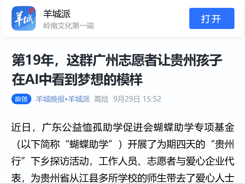 感谢【羊城晚报·羊城派】的报道! 近日,广东公益恤孤助学促进会蝴蝶助学专项基金(以下简称“蝴蝶助学”)开展了为期四天的“贵州行”下乡探访活动,工作人员、志愿者与爱心企业代表,为贵州省从江县多所学校的师生带去了爱心人士的捐赠和问候,这是蝴蝶助学连续第19年在贵州黔东南开展公益助学活动。 “我的梦想是当一名职业篮球运动员。”在从江县谷坪乡中心小学的教室里,五年级学生小花(化名)走上讲台,响亮地说出自己对未来的憧憬。 话音刚落,她身后的投影屏幕上,缓缓出现了一张小花长大后身穿篮球服的照片,画面中小花自信地运球,驰骋在篮球场上。全班同学顿时发出了阵阵的惊叹和热烈的掌声,仿佛球场上为同伴打气加油的啦啦队。 蝴蝶助学联合爱心企业共同策划了特别版“科普探索课堂”,企业工程师成为了支教志愿者,借助人工智能图像生成技术,帮助孩子们“穿越”到未来,看见自己梦想成真的模样。这也是这些孩子们第一次近距离感受AI的魅力。 除了AI体验,支教组志愿者精心设计了多个主题科普课堂。在“探月工程”课堂上,支教老师向同学们介绍了我国月球探测的有趣知识,孩子们不时举手提问。随后,同学们还亲手制作了“探月小车”模型,亲手拼接一个个小零件、连接电路,一辆辆小巧的探测车在课桌上“启程”,模拟执行月球勘探任务,课堂气氛热烈而专注。 临近中秋,蝴蝶助学此次贵州之行也带来了特别的节日问候。志愿者们带着由爱心人士亲手写下的祝福明信片以及1100份月饼礼盒,提前与孩子们共迎佳节,传递温暖。 此外,在本次探访活动中,“阅动计划”乡村学校图书室项目一共支持了从江县3个乡村小学的图书室建设,捐赠科普、自然科学和美育等书籍5000册,并为5校捐赠《百科全书》146套,总价值超过15万元,全部来自爱心企业和社会爱心人士。蝴蝶助学还为当地带去“应急安全支教”教师培训专场,让老师和一线工作人员,掌握这些科学的“救命”常识。 文| 记者 高焓 通讯员 张雪欣 郭雪敏 图|通讯员供图 责编:梁栋贤 校对:桂晴 审签:陈婉允