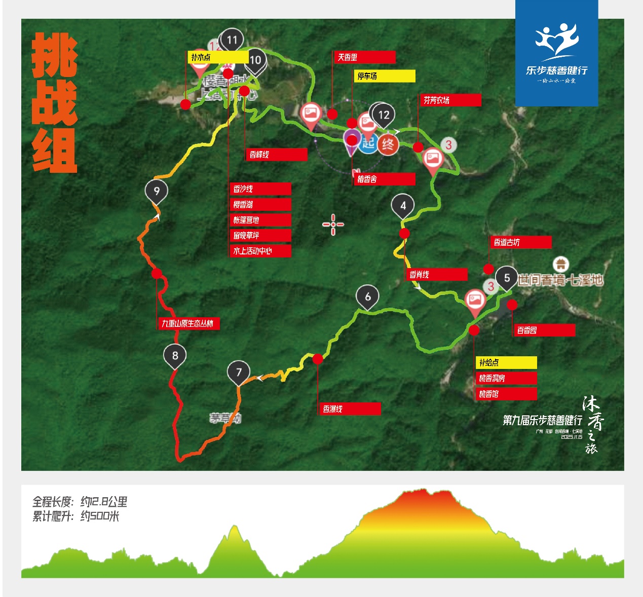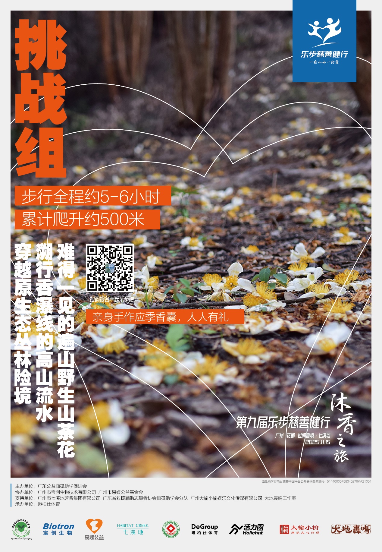 挑战组数据库 全程长度:约12.8公里 累计爬升:约500米 步行时长:约5-6小时 起点/终点:馨香大草坪 正所谓“无限风光在险峰”,每一届乐步健行活动中,沿途风景最完整、最惊艳的,当属路线最长、爬升最高的挑战组。这次也不例外——在体验组和休闲组的基础上,本届乐步慈善健行活动挑战组路线,将把世间香境·七溪地的“无限风光”尽收眼底。 挑战组的健行者们,请收好这份“沐香宝盒”,跟着它解锁七溪地的极致之美! 1 天然瀑布群: 白绸倾泻,泉声和鸣 因坐拥上亿株野生芳香植物,七溪地素有“世界最香的地方”之称。在这片8平方公里的秘境里,五里瀑布、七里峡谷、十里沙滩、百条溪流、百亩湖泊与千亩竹海相映成趣,共同勾勒出令人心驰神往的“现实版桃花源”。 五里的天然瀑布群,是挑战组的必经之路,沿途可打卡4个野生瀑布——最大者为游龙瀑,龙头高昂、龙尾摆动;其次为凤舞瀑,共同组成龙飞凤舞的壮观景象。五叠瀑水量充沛,如白绸倾泻,声势壮观;点石瀑清澈见底,与五叠瀑、龙凤瀑构成多层次的瀑布景观带。 “青山看不厌,流水趣何长。”阳光透过树梢,清泉石上流,泉声和鸣,仿佛在为大自然演奏一曲交响乐。 瀑布群落与山涧溪流、古树遮天形成天然屏障,山林葱郁,溪水流长。沿途还有上百种野生的芳香植物一路相伴,沐浴芬芳,令人心旷神怡。 2 九重山: 丛林历险,山茶如雪 沿着香瀑线向上攀登,便踏入了原生态山路,随处可见百年古藤、千年古树,枝干虬曲苍劲,仿佛置身丛林历险之境,野趣十足。 山间空气甚好,经中国计量认证,七溪地的负氧离子含量为6000个/ cm³,高于世界卫生组织清新空气标准4倍;上亿棵芳香植物散发出芬多精,每一口呼吸都神清气爽,24小时享受天然芳疗。 在这里,挑战组的健行者们将收获一份大山深处的礼物——乔木山茶花。 与休闲组途中的灌木山茶花不同,树高9米的乔木山茶花只有在高山处才得以一见,而像七溪地这样,上百万株漫山的野生乔木山茶花绽放的景象,更是罕见。 11月,正是山茶花盛开的季节,乔木山茶花树身光洁润滑,细腻如肌肤;其花洁白灿烂,从秋到春,满树花如堆雪,飘落时片片花瓣落英缤纷,远远望去,仿若南方独有的“纷飞大雪”。 登上九重山顶,视野瞬间开阔——一重山、两重山、三重山……极目远眺,群山万壑层峦叠嶂,云雾在山间缥缈;抬头是莽莽苍穹,仿佛伸手就能触碰星辰;低头俯瞰樱香湖,白沙如丝带、碧湖似明镜。 有人说,人生要见三次山:见山是山,见山不是山,最终见山还是山。站在九重山的山顶,看云霞从山间冉冉升起,追暮归的鸟儿隐入林海,尘世的烦恼会在刹那间烟消云散,只余满心舒畅与辽阔。 第九届乐步慈善健行,11月15日,花都世间香境·七溪地,邀您同行,共沐芳香。 乐步宣传伙伴,知名歌手、音乐人,陈明 撰文:廖杰(志愿者) 摄影:七溪地供图 编辑:万敏莹(志愿者)、薛紫瑜 审核:梁栋彬