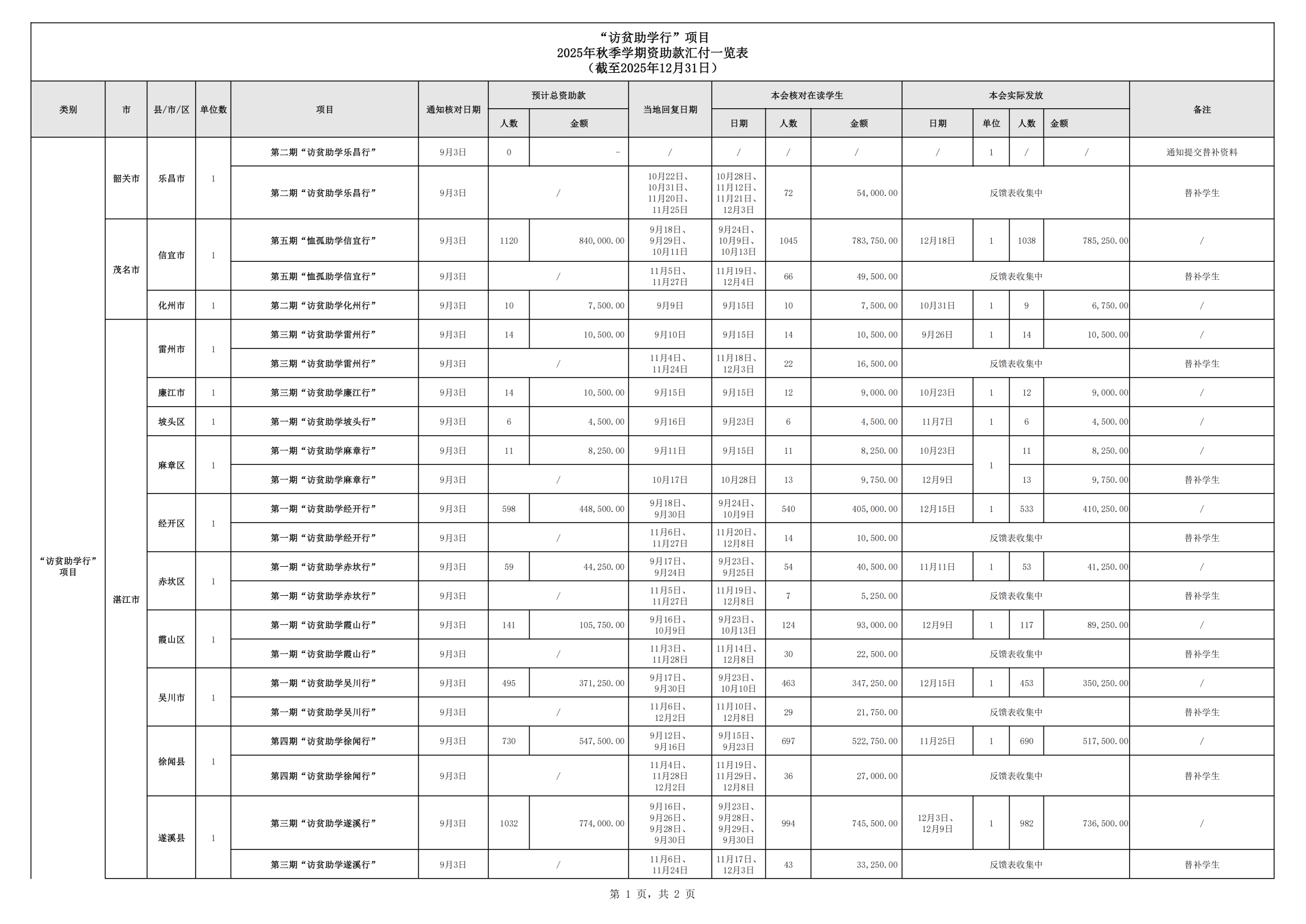 “访贫助学行”项目2025年秋季学期资助款汇付一览表(截至2025年12月31日)
