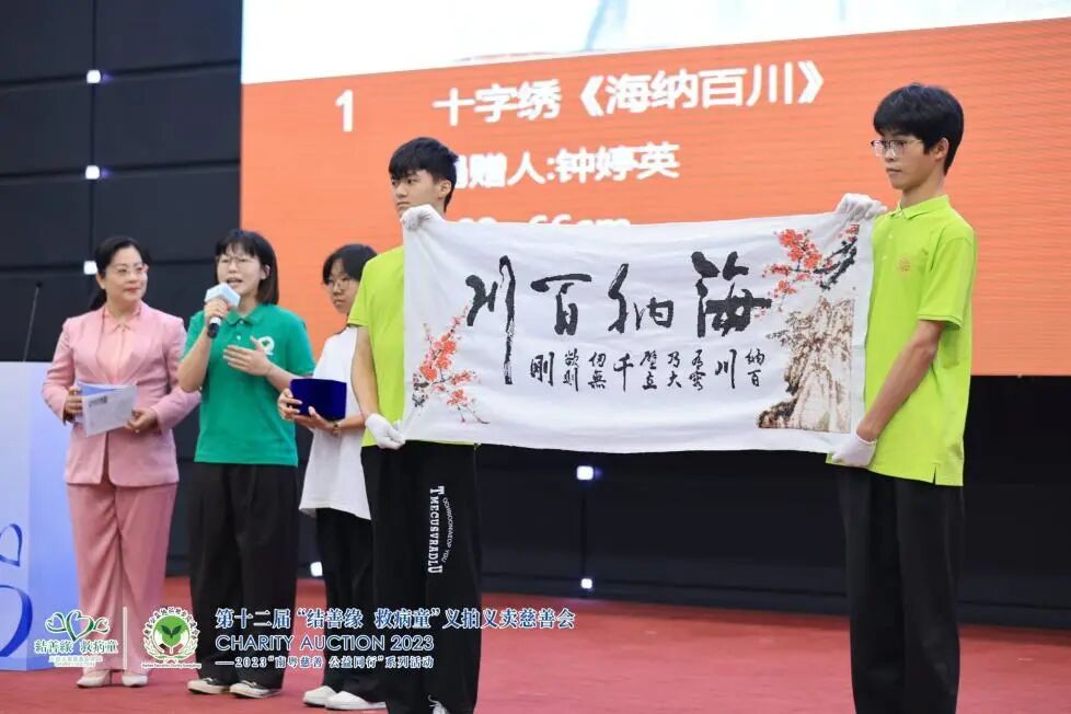 慈善会拍卖上,专程从广西赶来的“头箍女孩”婷婷,成了这幅《海纳百川》的助力官。婷婷曾患有先天性脊柱侧弯,一度需要戴着头箍来矫形,她的母亲靠在街头卖手工花为她筹钱治病,后来,在恤孤助学会的帮助下,婷婷完成了一次次的手术,现在,她已经恢复健康,顺利考入了家乡的高中。前几届慈善拍卖会上,婷婷妈妈都会亲手做一套永生花工艺品用于拍卖,曾经筹得过10万元善款,帮助了6名病童。这次,婷婷专程向老师请假,又带来了亲手做的永生花,作为0号拍品的特别礼物,献给拍得0号拍品的好心人,也以此感谢曾经给予她们帮助的爱心人士。最终,这幅0号拍品《海纳百川》以3万元成交。