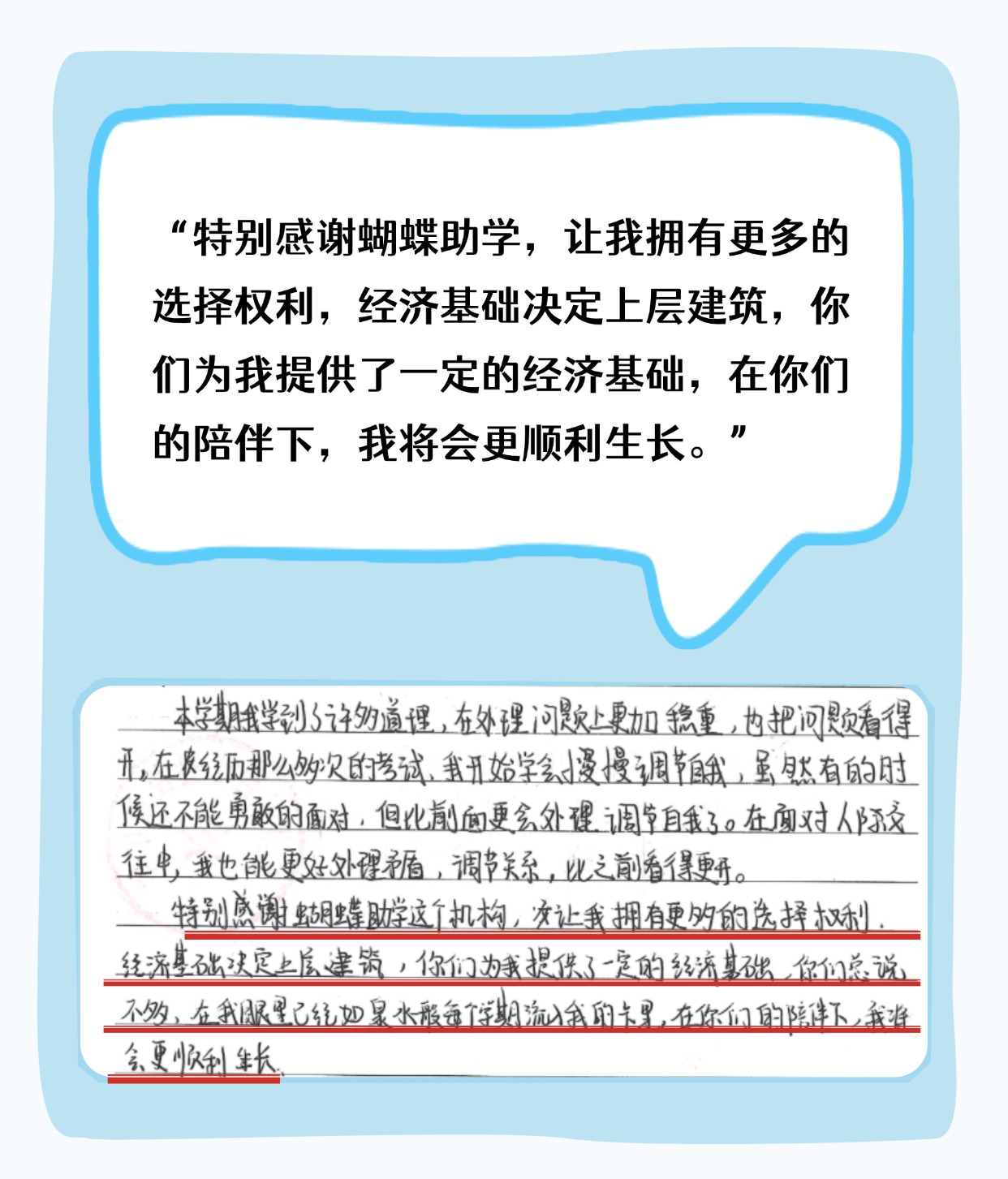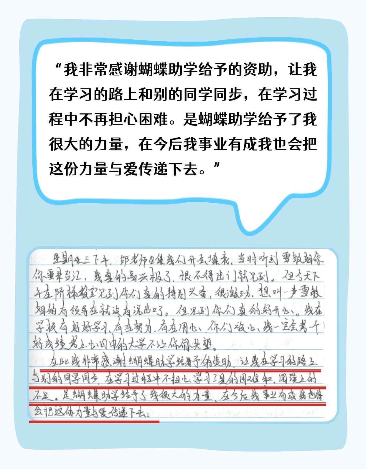 新学期,我们收到了来自远方的信件。 “在你们的陪伴下,我将会更顺利成长……” 展信悦,字里行间,我们看到了善意如何悄然改变一个生命的故事。 滑动图片查看更多学生信件 这些受助孩子的亲笔信,是改变发生的最好证明,也是我们再次出发的理由。 爱,需要延续。新一期拟资助学生名单已就位,您的一份善意,能直接改变一个孩子的命运。期待与您一起,创造更多温暖的回信。 广东公益恤孤助学促进会蝴蝶助学专项基金 2025年度秋季学期“困境学生助学”项目(贵州省) 确认资助名单及认捐资助须知 经学生自主申请、学校初审、县教育局/镇政府审批,以及广东公益恤孤助学促进会蝴蝶助学专项基金(以下简称“蝴蝶助学”)专项组逐户家访核查,2025年度秋季学期“困境学生助学”项目(贵州省)最终确认资助21名困境学生。现将资助详情公示如下: (点击图片查看大图) 图|2025年度秋季学期蝴蝶助学专项基金 困境学生助学项目确认资助学生名单 注:按照2024年民政部等18部门印发《困境儿童个人信息保护工作办法》规定,为规范困境儿童个人信息使用,保护困境儿童个人信息安全,维护困境儿童合法权益,我会向捐赠人仅提供经脱敏处理的学生信息。如您希望进一步了解或核查,可以联系我会,要求现场查看学生原材料。 资助标准及期限 【资助标准】 每名学生的资助标准为4,500元/三年,在读学生每人每学期750元,共6个学期(2025年秋季学期至2028年春季学期)。 【资助期限】 完成资助款募捐后的本学期开始发放,原则上高中毕业时终止。 【资助款发放方式】 按照蝴蝶助学资助工作流程和与学校签订的《资助协议》,每学期开学时核对每位受助学生就读等情况,同时将受助学生的学期反馈表(含来信)寄给本会,本会审核《反馈表》后向对口资助人进行反馈,并按在读学生每人每学期750元的标准将资助款汇付至学生申报的本人银行账户,爱心包物资按照实物形式在每年度春季学期派发,由学校协助核实学生签收工作。 资助方式 【方式一:一对一认捐】 捐赠人按照4,500元/人/三年的标准对口认捐。完成捐款后,我会将提供《资助确认函》,明确对口资助对象,将每学期提供该生的信息反馈。 捐赠人可获得的信息反馈包括如下: (1)《公益事业捐赠专用收据》; (2)《资助确认函》; (3)每学期学生《反馈表》(含学生回信); (4)该生大学录取奖学金捐赠或续捐优先权。 【方式二:随缘乐捐】 捐赠款项将用于支持开展困境学生成长关怀活动及补充爱心包物资,支出信息将通过官网、公众号发布。 一对一资助认捐流程 【联系蝴蝶助学填写意向登记】 请先联系蝴蝶助学公益热线填写意向登记:15889949715(微信同号,工作时间09:00-17:00) 【捐款方式】 1、银行转账 账户名称:广东公益恤孤助学促进会蝴蝶助学专项基金 银行账号:4403 2601 0400 1336 6 开户银行:中国农业银行广州远洋宾馆支行 转账备注:您的姓名和联系电话 2、灵析捐款入口 第一步:选择金额 1、 一对一资助请点选4500元 2、随缘乐捐可以“自定金额”,用于学生成长关怀活动及补充物资。 第二步:填写捐赠人信息并按提示完成支付。 第三步:可同步申请开具捐赠收据。 【温馨提示】 1、确定对口资助学生后需在24小时内完成捐赠支付,捐款一经转账不可申请退款。 2、由于对困境学生的资助持续三年的时间,在这期间受助学生的个人情况可能发生改变。如受助学生辍学、外出打工、家庭经济状况好转、外迁、去世或发生其他不符合资助条件的情况时,本会将停止资助。结余资助款由本项目符合资助条件的替补学生,经本会审核后进行替补资助。如当地没有合适的替补对象,本会将提前与对口捐赠人协商同意后,结余资助款将用于“困境学生助学”项目成长关怀活动支出。 自2006年起,蝴蝶助学以贵州省及广东省困境学生为对象,持续以“一对一助学”、“学习包”等形式对困境学童提供助学支持,助力更多学生完成升学梦想。截至2025年秋季学期,项目已累计为贵州、广东等地超3301人次困境学生提供助学支持。 项目严格执行《资助协议》流程,通过一对一入户家访核查确保资助精准性,并定期公示善款使用情况,接受社会监督。 蝴蝶助学希望能与各位爱心人士继续携手,为困境学子点亮求学之路! 编辑|郭雪敏 审核|张雪欣