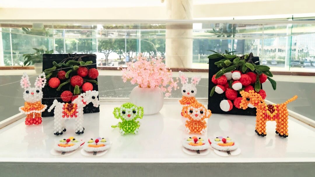 串珠动物玩偶、手编幸福花、扭扭棒发饰与创意绒花盆栽,以及师生们绘图的小镜子、杯垫和徽章随处可见。以岭南荔枝为灵感的扭扭棒与水晶粘贴作品,造型逼真、色彩生动。运用掐丝珐琅工艺制作的景泰蓝发簪也让人爱不释手。