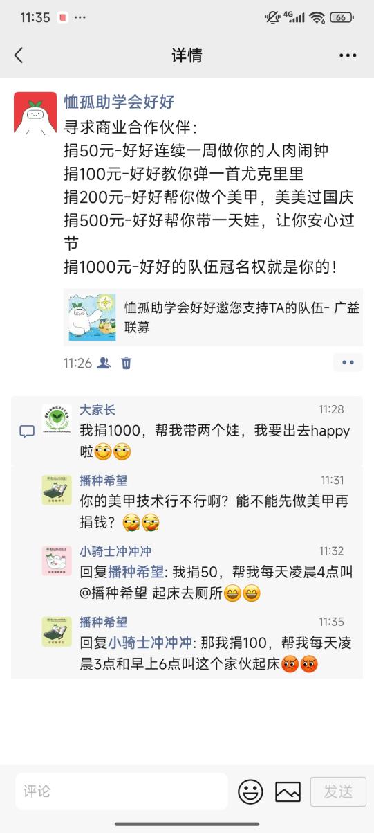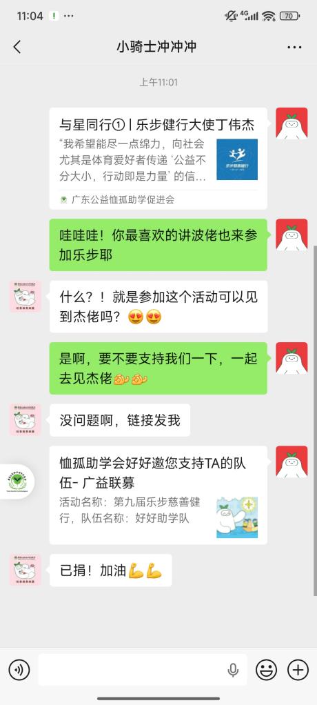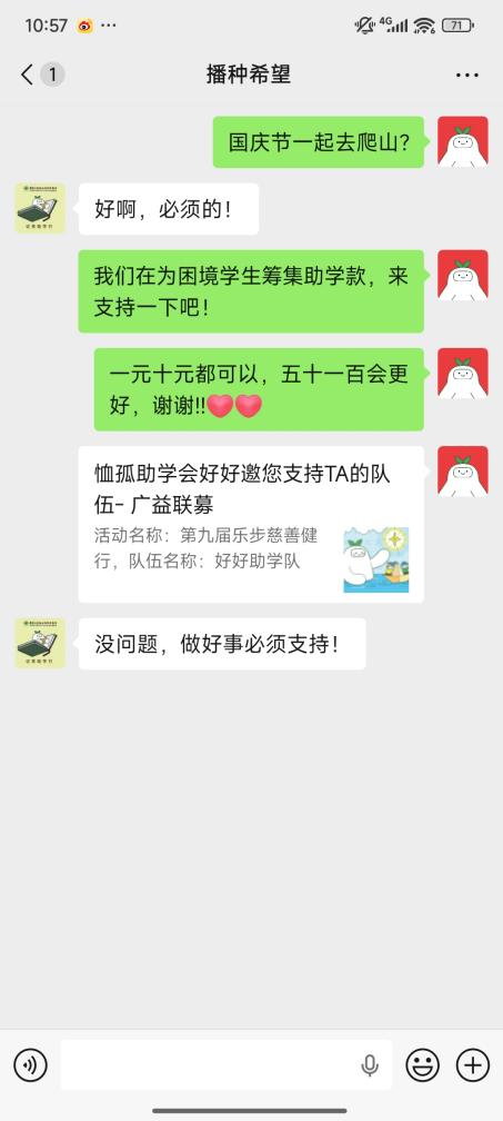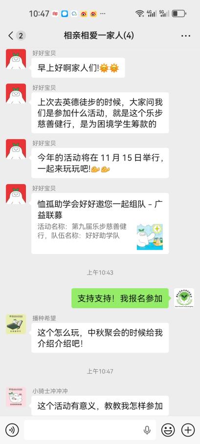 国庆中秋双节即将到来 这个超超超超长的8天长假里 各种亲友聚会自然少不了 除了房子车子孩子这些话题外 还有什么有趣又温暖的话题呢? 不如聊聊组队参加乐步 为家庭经济困难的学生筹集善款 让这个假期因善行而更难忘! 1 聚会聊天暖心选项: “组队挑战吧!” 已经决定参加乐步,但是还没找到队友?亲友聚会就是最好的时机,以分享往届参加乐步的趣事和所资助学生的情况为聊天的切入口,更能展示活动的趣味性和意义性,让亲友更心动,愿意加入你的善行,队伍就能组好啦! 2 聚会聊天暖心选项: “直接支持我的善行!” 组建好队伍,下一步就是筹款了。无数的队伍筹款经验表明,最有效的筹款方式就是点对点的劝募,直接邀约对方捐赠,成功率会大大提升,而面对面的沟通还能更好地向对方介绍你的善行,让大家更愿意支持你。 其实大部分人都有一份愿意做好事的心,只是很多人缺少一个可信任的渠道去释放自己的善意,有你的介绍和背书,会让朋友更加信任,更愿意去捐赠。我们不是在为自己谋利益,是在共同为困境学生谋一条改变人生的道路。 3 聚会聊天暖心选项: “明星也在走,我们跟上!” 今年乐步可谓是“星光熠熠”,除了我们的“老朋友”资深体育评述员丁伟杰、广东广播电视台主持人黎绮雯外,还有两位刚刚参加完我们仲夏夜慈善音乐会的知名音乐人江碧然和麦子杰,也会一同参加本届乐步,和我们一起健行。 除此外,还有更多重量级明星担任我们的宣传伙伴,欢迎关注我们的官网、官方公众号和视频号“广东公益恤孤助学促进会”,及小红书号“恤孤助学会好好”,让我们跟上明星们的步伐,一起乐步吧! 4 聚会聊天暖心选项: “来参加我的公益家宴吧!” 亲友聚会少不了吃吃喝喝,不如趁着这个时机,举办一场公益家宴,住家晚宴、露营烧烤、甜品下午茶......擅长做什么美食,就举行什么活动,邀请朋友参加,在宴会上说明筹款目的,邀请参加宴会的朋友支持一下队伍。既增进了与朋友间的关系,又能为队伍筹款,也是一个很不错的主意哦! 5 聚会聊天暖心选项: “筹款挑战赛,敢来接招吗?” 健行者发起一项一周挑战赛,如步数挑战(一周每天走1万步)、阅读挑战(一周阅读完一本书)、运动挑战(一周每天锻炼1小时)等,邀请朋友们加入挑战,如果一周之后有小伙伴没有完成挑战,就需要捐一笔款项到队伍里。既可以促进朋友们参与健康生活,又能为队伍筹款,来试试看吧! 6 聚会聊天暖心选项: “捐款换行为,一起来玩吧!” 捐款换行为,也是非常有意思的玩法,例如捐50元,做你一周的人肉闹钟;捐一笔,把你的名字写在T恤上,带着你的爱去徒步...... 有些健行者擅长做一些手作,或者有一些技能,我们也建议大家可以将这些手作或技能做回赠或者义卖。 往届连续多年获得劝募之星的队伍,就是拿出了自家的产品回赠给捐赠支持他们队伍的亲友。有的队伍是开餐厅的,他们邀请客人捐赠支持,并给回赠小餐点或全单打折,让食客吃得开心,也一起参与了公益,一举多得。 这个假期,一起聊聊“如何改变人生”,让团圆更有温度,让聊天更有深度! 撰文:薛紫瑜 编辑:薛紫瑜 审核:梁栋彬