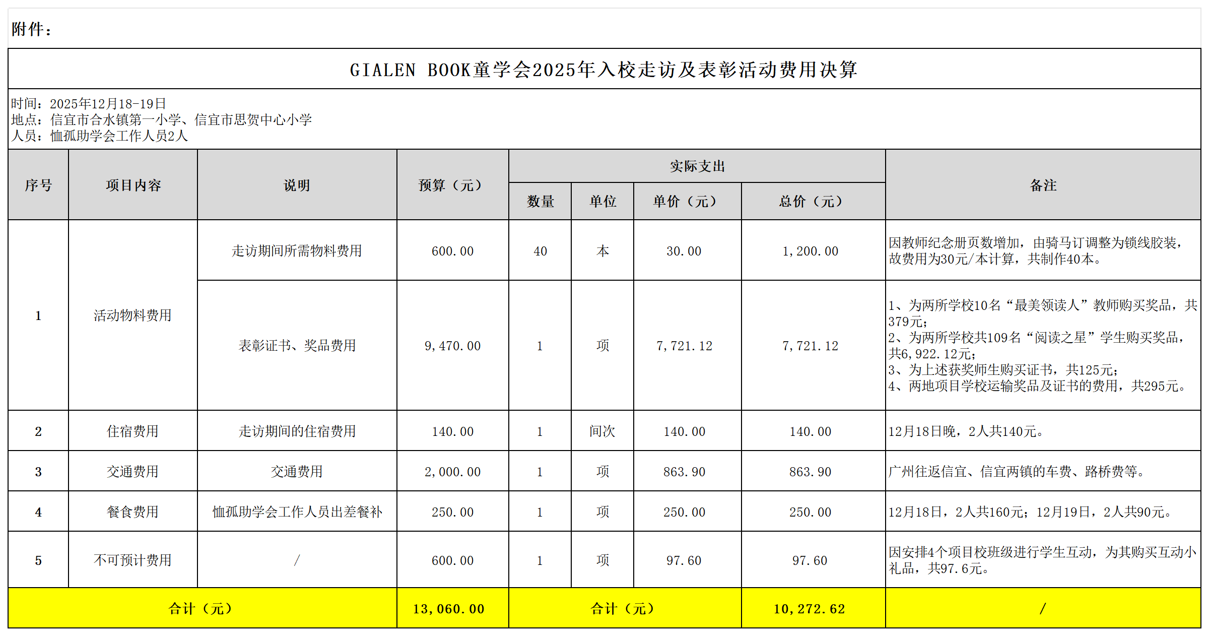 2025年,广东公益恤孤助学促进会(以下简称本会)联合信宜市合水镇中心学校、思贺镇中心学校在两镇选点开展GIALEN BOOK童学会乡村儿童阅读服务项目(以下简称项目)。本会为合水镇第一小学、思贺中心小学的学生派发2,197份“好好”阅读包及适龄的班级读物,并开展阅读包派发活动、阅读游园会、作家课堂、“书香趣绘”主题创作大赛、“阅读之星”评选等活动,激发学生的阅读兴趣,提升教师的阅读技巧和教学能力,营造校园浓厚的阅读氛围。 12月,本会前往项目校走访调研,听取学生、教师和校方领导的反馈,了解项目落地实情;并表彰在项目中表现积极的师生,以榜样力量带动他人。 12月18日下午、19 日上午,项目团队分别来到思贺中心小学、合水镇第一小学,通过入校实地走访的形式,与项目校领导、教师了解项目校如何利用阅读资源开展阅读相关活动,复盘2025年项目落地情况与不足,共同探讨2026年项目落地设想。此外,项目团队走进班级中,与学生进行互动,了解学生使用阅读包的情况及阅读交换方式,倾听学生们与好好阅读包的故事。 本次活动中还设置了年度表彰环节,项目团队结合项目开展情况及校方推选,对2025年在阅读方面表现积极、优秀的师生进行表彰。具体表彰情况如下: 1.“最美领读人”教师:日常积极开展阅读活动、踊跃反馈阅读照片的项目校教师,由两镇中心学校及项目团队共同推选产生,最终共有10名教师获此殊荣。 2.“阅读之星”学生:两地项目校的教师们根据学生们的阅读频率、万卷计划手册填写情况,以及每个年级约4%的占比名额,选出共109名学生阅读榜样。 3.2025年“书香趣绘”主题创作大赛获奖师生:表彰在主题创作大赛中获得奖项的师生,其中获奖学生60名、优秀指导教师32名。 1.书籍与活动相结合,提升阅读资源的有效利用。 结合2024年项目走访经验,对2025年项目提供的阅读资源进行升级。项目校的每位学生不仅人手一份专属的好好阅读包,各班级还配套添置了丰富的英语绘本、“快乐读书吧”等班级读物。借助这些阅读资源,项目团队开展阅读主题游园会、“书香趣绘”主题创作大赛、阅读之星评选等系列活动。学生在依托这些阅读资源参与各项活动时,不仅提升自身阅读能力和兴趣,还收获了赞许与肯定。这些举措,让书籍从“陈列品”变成学生手中的“活教材”,实现了阅读资源的有效利用与价值最大化。 2.实地了解项目开展情况,动态调整项目工作方向。 本次活动采取入校走访的方式,通过与校方、教师及学生多维度视角了解项目执行情况,以及项目校在推进过程中面临的不足与挑战,共同探讨后续推进方式。 合水镇第一小学一直深耕阅读领域并探索,2025年在阅读资源的支持下,开展的阅读课堂、趣味阅读活动更加趋于常态化、系统化,后续项目校将重点关注和培养在阅读方面积极参与的教师,将开展阅读课堂的方法提炼出来,并带动其他教师加入到阅读推广中。 思贺中心小学是首次接收本会捐赠阅读资源的项目校,师生对于阅读资源的到来,表现欣喜和激动,对阅读包也是爱不释手。而在此次走访中,项目工作人员发现,思贺中心小学对于如何使用阅读包中的工具、如何引导学生进行书籍交换、如何开展阅读主题活动等推动工作存在挑战。借此,项目工作人员与校方共同探讨解决思路,计划后续在学生早读时除了静读外,还增加阅读分享、阅读感悟接力等环节,以此方式培养学生的综合能力,增长教师开展阅读活动的实操经验。 3.以榜样力量带动他人,激励师生继续阅读。 本次活动还设置了项目年度表彰环节,对参与乡村阅读推广的师生们进行表彰和感谢,让真实而鲜活的榜样力量在校园中自然流动。活动现场,师生们不仅感受到阅读带来的改变与力量,也在表彰中获得了肯定与动力。 许多学生在活动结束后表示,之后要多向被表彰的同学积极请教,把阅读当成一种生活习惯,继续保持对阅读的热爱。被表彰的教师们也纷纷分享着,此次被授予的荣誉是学校对其工作的认可,未来将继续在课堂中播撒阅读的种子,为乡村阅读推广工作尽自己的一份力。 1.活动的顺利开展,离不开活动前筹备阶段的充分准备。在筹备阶段中,项目工作人员需要合理规划并统筹活动开展过程中的各项细化工作,及时与合作方沟通活动推进情况,为后续活动开展奠定基础。 建议: (1)做好活动统筹工作。合理规划活动内容并细化活动流程,对走访及表彰环节中涉及的工作进行细致、全面的考虑,确保活动的有序进行。 (2)加强沟通。活动筹备阶段,与校方保持常态化、紧密的沟通,定期跟进活动推进情况,确保双方工作进度一致。 2.活动开展过程中,会出现突发情况,项目工作人员应及时了解活动开展动态,当突发事件发生时,及时与相关方沟通、解决;活动结束后与同事探讨突发事件产生的原因及积累相关经验。 建议: (1)发现问题,及时补位、解决。项目人员在执行过程中,面对客观因素造成的执行阻碍,同事之间相互补位、协作,及时解决问题的发生,推动活动顺利开展。 (2)关注经验积累。活动结束后,与同事间探讨活动执行情况,反思不足,及后续可优化的建议,注重每一次活动开展后的经验积累。 3.项目落地前,项目工作人员向校方领导、对接人介绍项目背景、项目具体内容等项目信息力度不足,导致相关方对项目及项目资源的认识度不高,从而在一