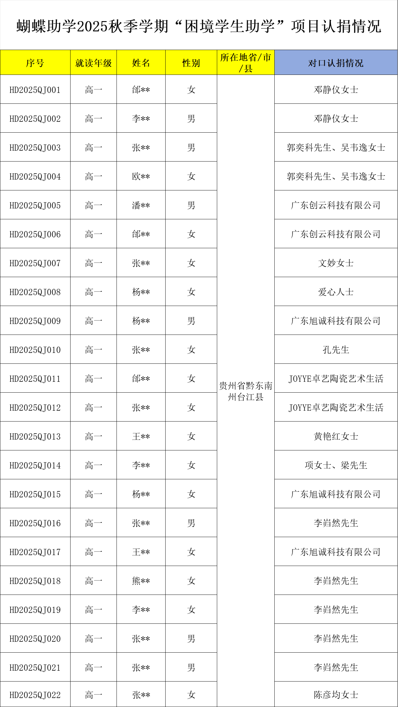 广东公益恤孤助学促进会蝴蝶助学专项基金 2025年度秋季学期“困境学生助学”项目 认捐情况公示 经学生自主申请、学校初审、县教育局/镇政府审批,以及广东公益恤孤助学促进会蝴蝶助学专项基金(以下简称“蝴蝶助学”)专项组逐户家访核查,“困境学生助学”项目2025年度秋季学期最终确认资助22名困境学生。 目前,所有学生均已落实“一对一”对口认捐,现将资助详情公示如下: (点击图片查看大图) 图|受助学生一对一认捐情况 注:按照2024年民政部等18部门印发《困境儿童个人信息保护工作办法》规定,为规范困境儿童个人信息使用,保护困境儿童个人信息安全,维护困境儿童合法权益,我会向捐赠人仅提供经脱敏处理的学生信息。如您希望进一步了解或核查,可以联系我会,要求现场查看学生原材料。 2025年秋季学期“困境学生助学”项目 资助款拨付情况公示 根据我会资助协议,每名受资助学生将获得三年共4500元资助,按750元/学期,分6期发放。 2025学年秋季学期助学款已全额拨付,合计61人次,支出总额 45,750元。详细拨付情况公示如下: (点击图片查看大图) 图|2025学年秋季学期助学款拨付情况 一份额外的关爱,照亮更远的未来 一对一助学是孩子们成长的基石,而他们的全面发展更需要社会持续的温暖关怀。 如果您希望以更多元的方式,继续为困境学生们的成长注入力量,我们诚邀您支持“困境学生助学”项目系列成长关怀活动,通过组织夏令营、兴趣活动、发放“学习包”等形式,助力他们自信、阳光地成长。 扫描上方二维码,即可支持成长关怀活动 捐赠学习包、温暖包等物资 每一份额外的支持,都将化为他们脸上多一份的笑容,心中多一份的底气。 (插入视频) 编辑|郭雪敏 审核|张雪欣