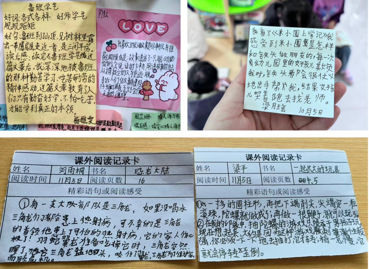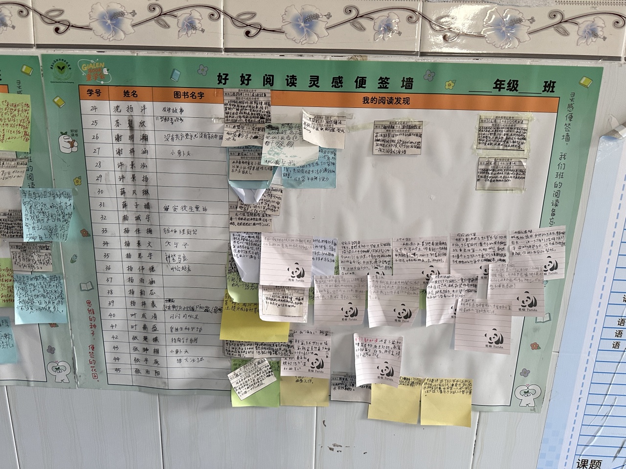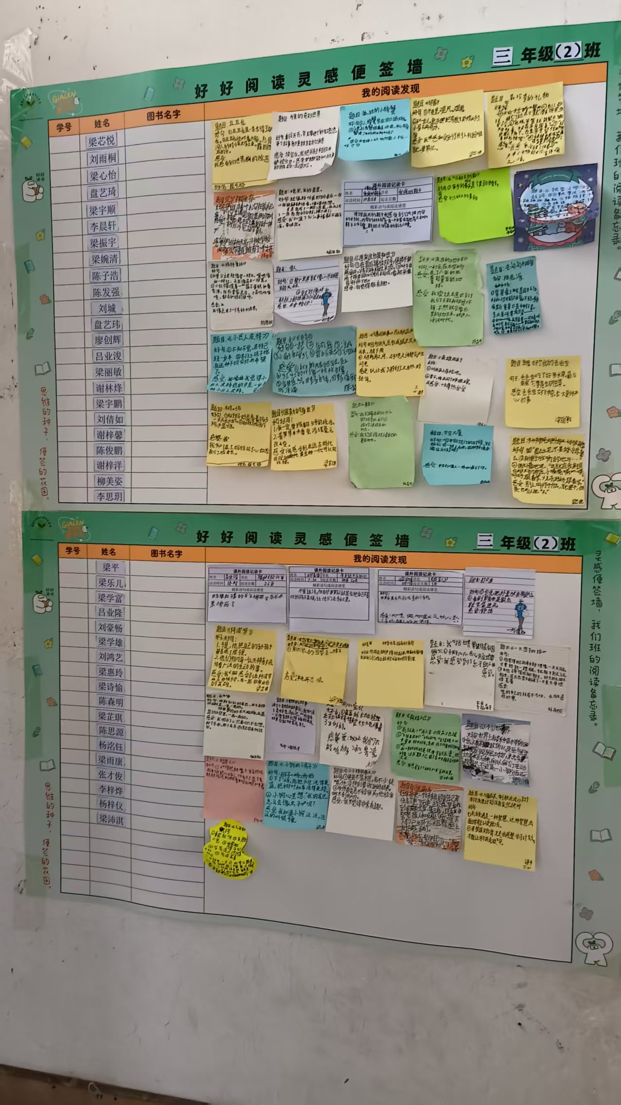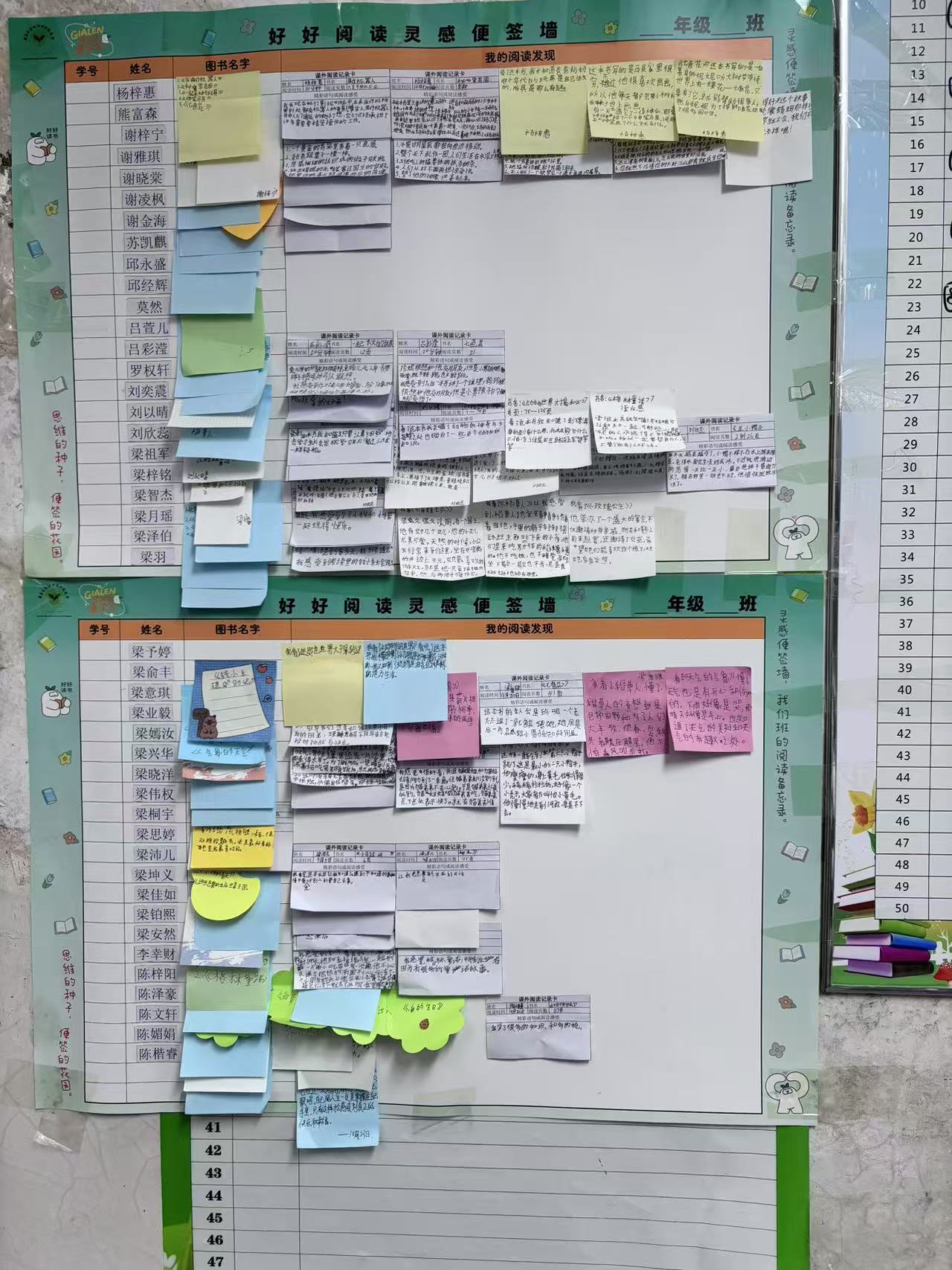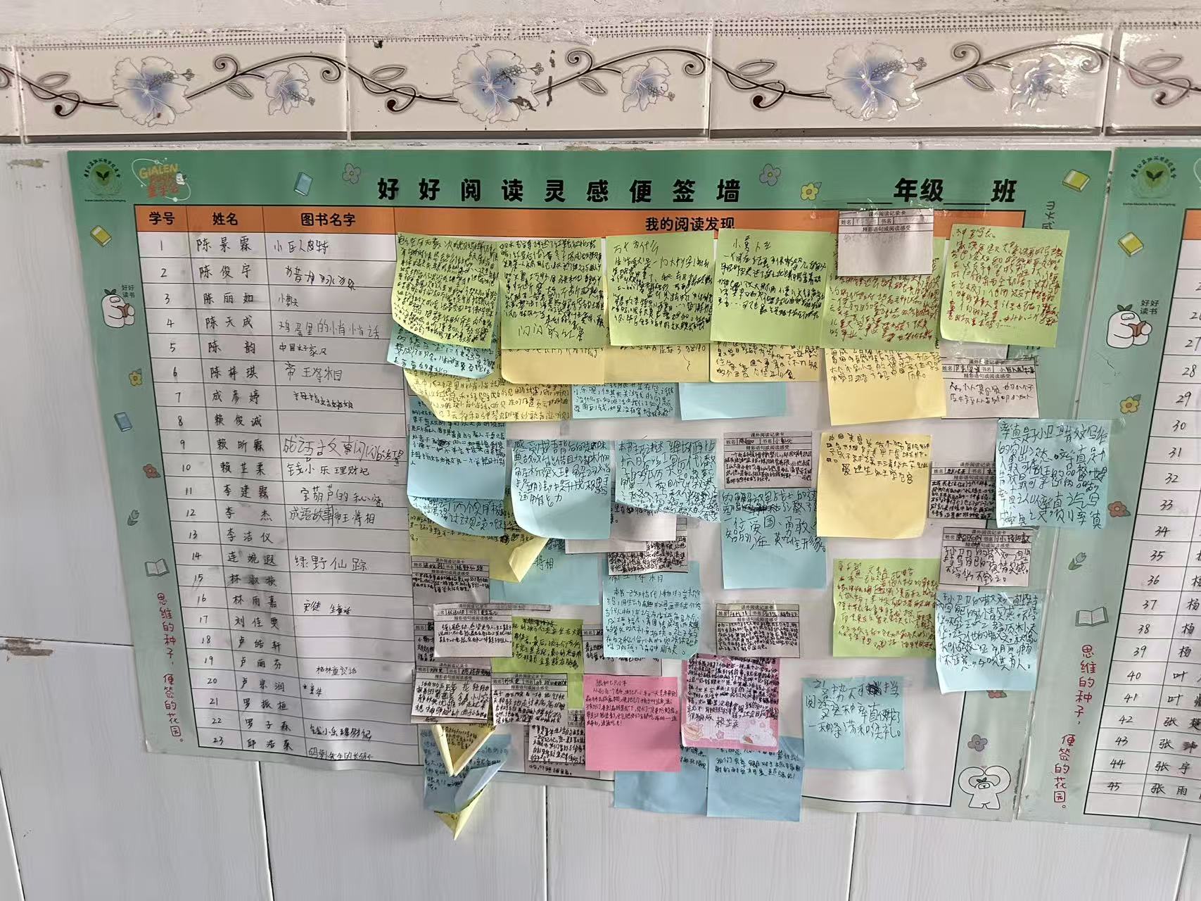 而学生们的成长,正藏在那面贴满便签的墙上——每张色彩各异的便签,都记录着学生们阅读后的感悟、灵光一闪的思考,或是从书中收获的勇气与智慧。字迹稚嫩却真挚,想法纯粹又热烈,一张张便签层层叠叠、密密麻麻,既见证了阅读资源被充分利用的实效,更让每一份成长都有迹可循、清晰可见。