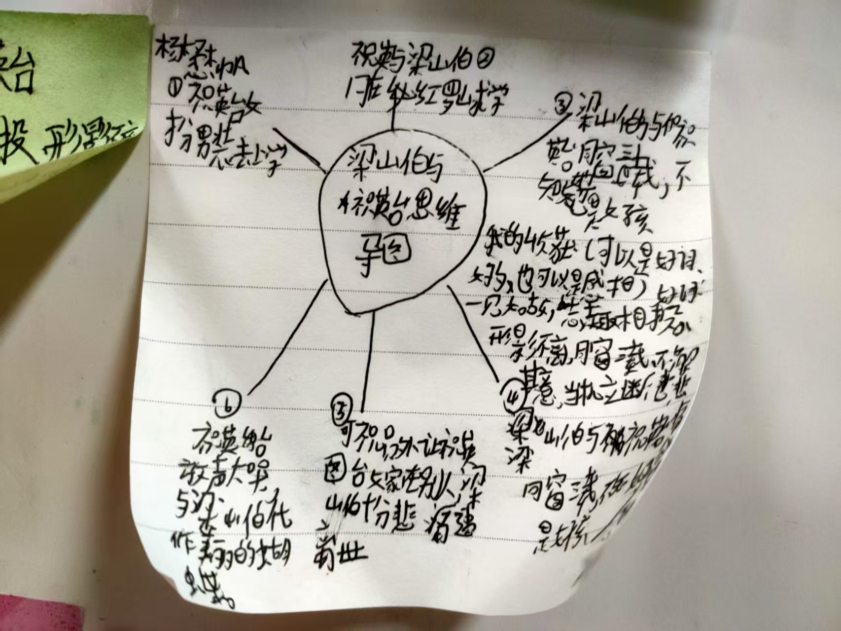 这张思维导图是出自项目学校一名五年级学生之手。Ta用思维导图记录了祝英台女扮男装求学,到与梁山伯结拜同窗,再到分离的悲切、最后化蝶的浪漫,故事里的关键情节都被清晰地梳理。学生除了对故事情节的分析,还摘抄了故事中的好词好句。每一笔都藏着ta对这个经典故事的理解,对阅读的喜爱。