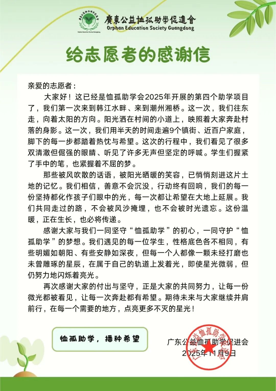 给志愿者的感谢信 亲爱的志愿者: 大家好!这已经是恤孤助学会2025年开展的第四个助学项目了,我们第一次来到韩江水畔、来到潮州湘桥。这一次,我们往东走,向着太阳的方向。阳光洒在村间的小道上,映照着大家奔赴村落的身影。这一次,我们用半天的时间走遍9个镇街、近百户家庭,脚下的每一步都踏着热忱与希望。这次的行程中,我们看见了很多双清澈但倔强的眼睛、听见了许多无声但坚定的呼喊。学生们握紧了手中的笔,也紧握着不屈的梦。 那些被风吹散的话语,被阳光晒暖的笑容,已悄悄刻进这片土地的记忆。我们相信,善意不会沉没,行动终有回响,我们的每一份坚持都化作孩子们眼中的光,每一次奔赴都让希望在大地上延展。我们共同走过的路,不会被风沙掩埋,也不会被时光遗忘。这份温暖,正在生长,也必将传递。 感谢大家与我们一同坚守“恤孤助学”的初心,一同守护“恤孤助学”的梦想。我们遇见的每一位学生,性格底色各不相同,有些明媚如朝阳、有些安静如深夜,但每一个人都像一颗未经打磨也未曾雕琢的星辰,在属于自己的轨道上发着光,即使星光微弱,但仍努力地闪烁着亮光。 再次感谢大家的付出与坚守,正是大家的共同努力,让每一份微光都被看见,让每一次奔赴都有希望。期待未来与大家继续并肩前行,在每一个需要的地方,点亮更多不灭的星光!