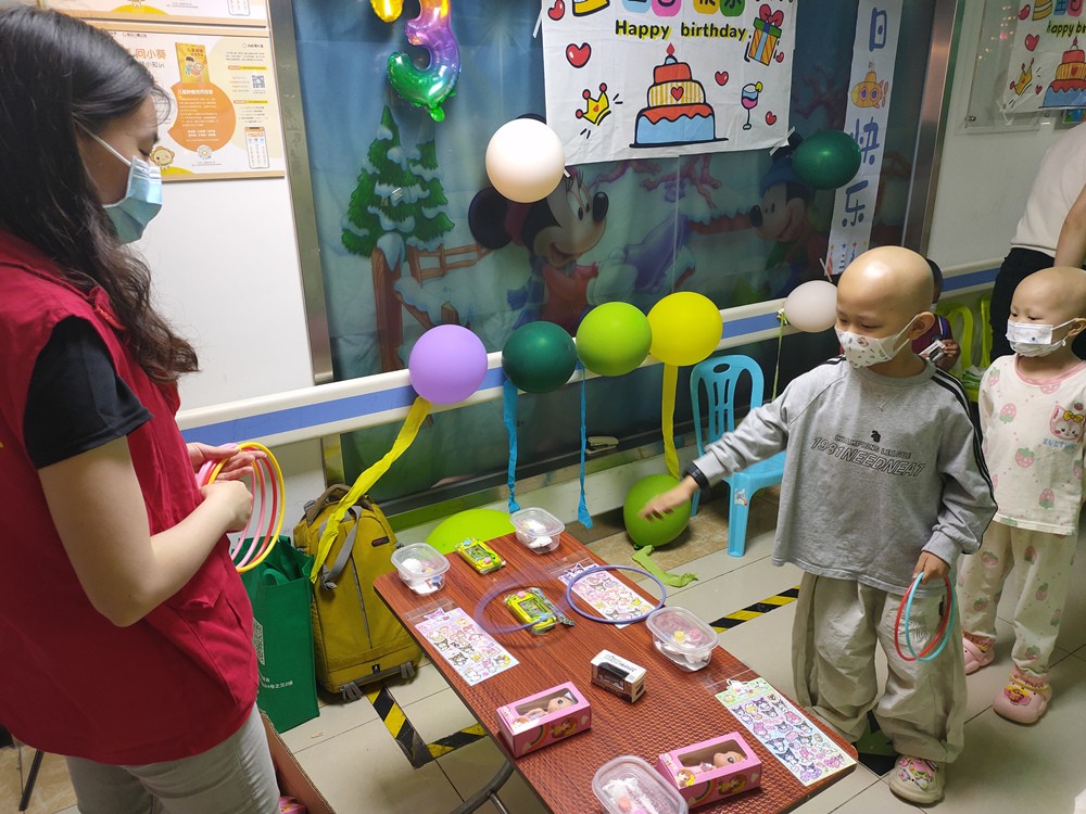 活动迎来最热烈的套圈环节时,整条走廊顿时沸腾起来!桌子上摆放的娃娃、游戏机、小汽车和拼图等奖品让患儿们跃跃欲试。医务社工们化身“游戏守护者”,悄悄调整套圈落桌位置,确保每个孩子都能获得心仪奖品。伴随着热烈的欢呼声和掌声,每位患儿都怀抱着战利品回到座位上,脸蛋上绽放的笑容比奖品还要闪耀。