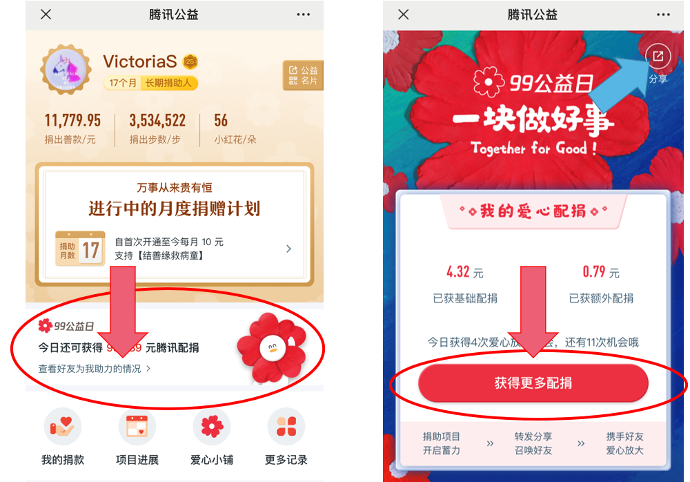 在腾讯公益的个人中心,点“查看好友助力情况”,分享给好友助力