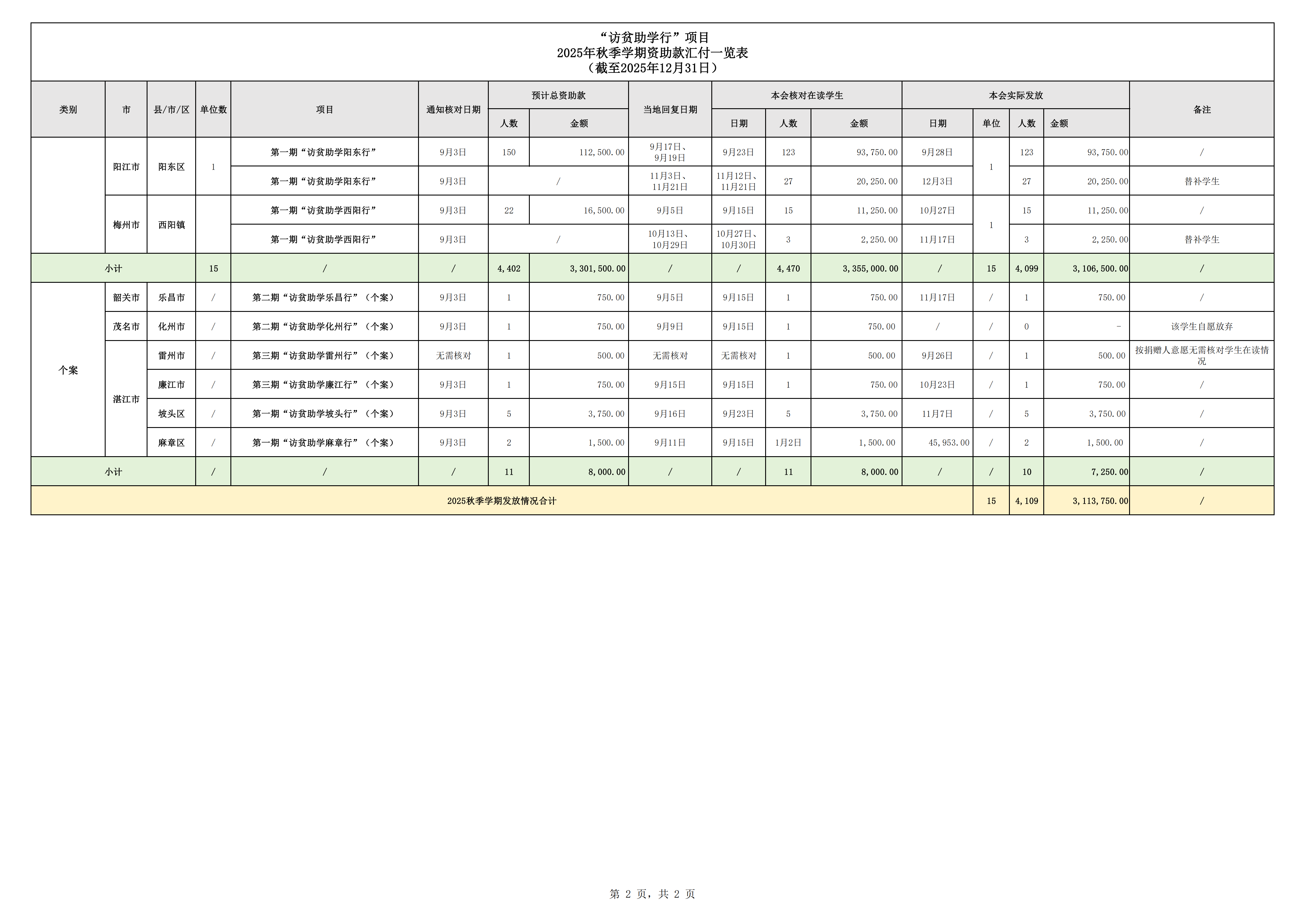 “访贫助学行”项目2025年秋季学期资助款汇付一览表(截至2025年12月31日)