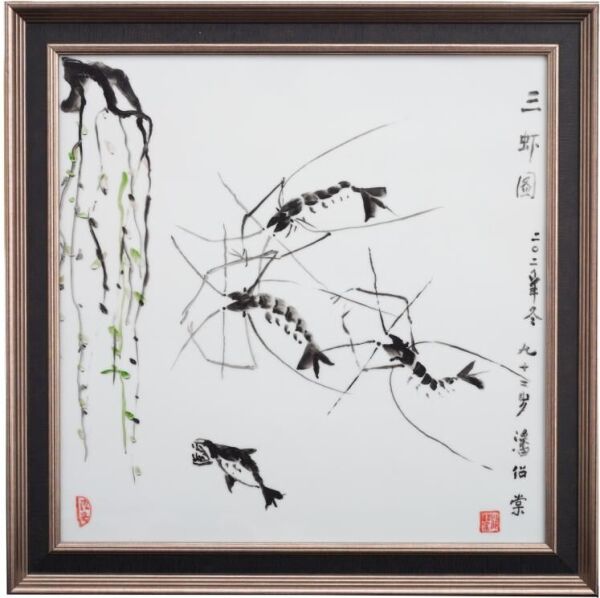 拍品中当然也少不了许多大师名家的作品。如徐悲鸿的弟子、曾获“中国工艺美术终身成就奖”的杰出雕塑家潘绍棠先生创作的陶瓷彩绘《三虾图》;非物质文化遗产项目(广州榄雕)国家级代表性传承人曾昭鸿的榄雕作品《四季平安》;中国工艺美术大师、中国陶瓷艺术大师、中国非物质文化遗产项目传承人潘柏林的生肖陶艺《乐享丰年》;被誉为画坛“苏氏五杰”的国家一级美术师、广州市政协书画院副院长苏小华捐赠自己的书法作品《禅茶一味》和国画作品《兰花》……