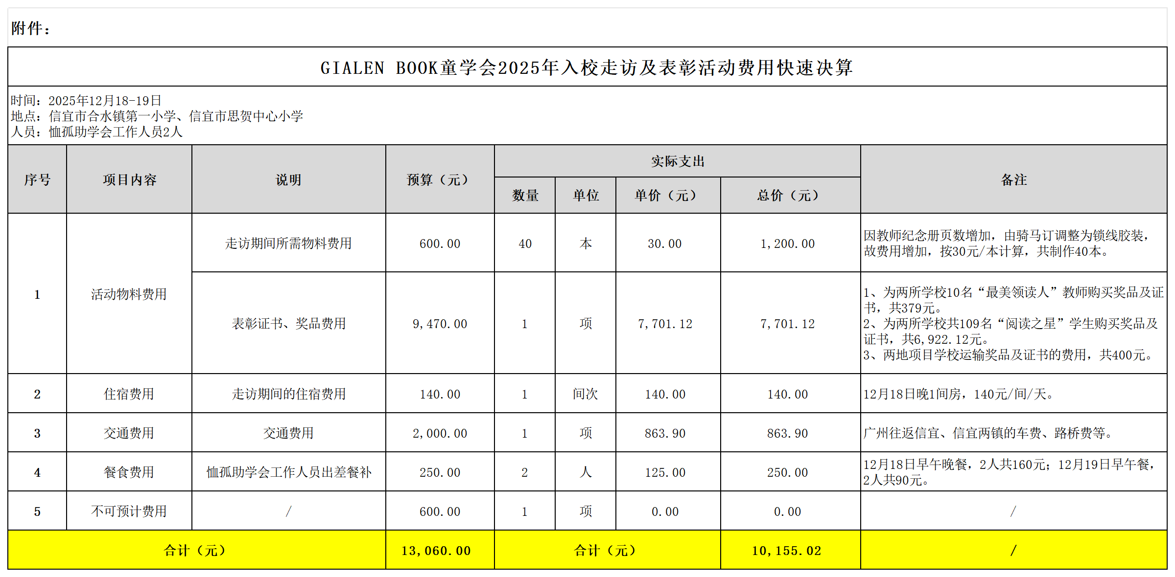 2025年12月18日至19日,广东公益恤孤助学促进会(下称本会)联合信宜市合水镇中心学校、信宜市思贺镇中心学校,在广州娇兰化妆品连锁有限公司的支持下,开展GIALEN BOOK童学会2025年入校走访及表彰活动。本次活动前往项目学校走访调研,听取学生、教师和校方领导的反馈,了解项目落地实情;并表彰在项目中表现积极的师生,以榜样力量带动他人。 PART 1 走访学生,见证每一份成长 12月18日下午、19日上午,项目团队分别来到思贺中心小学、合水镇第一小学的班级中,和学生们开启了一场特别又轻松的互动时光。 “好好阅读包里有哪些宝贝?哪一样是你们的最爱?”“会和小伙伴分享喜欢的书籍,把阅读感悟写进万卷计划手册中里吗?”“班级的《快乐读书吧》和英语绘本,你们都是怎么借阅、怎么阅读的呢?”项目工作人员倾听学生们与好好阅读包的故事,了解学生对阅读资源的使用情况,以及对好好阅读包的喜爱程度。 翻看着一本本用文字和图案填满的万卷计划手册,项目工作人员为学生们坚持阅读的好习惯点赞,还鼓励学生们继续保持对阅读的热爱。有不少学生细心发现,班级里每个阅读包中的三本书籍均不相同,有扣人心弦的绘本故事,有启迪智慧的益智类图书,有滋养心灵的情绪管理读本....无论是哪种类型的书籍,都深受学生们的喜爱。学生们对于书籍的阅读形式也是多种多样的,学生们会在课间交换阅读包中的书籍,会彼此分享书中的故事情节,也会围坐在一起共读。离开教室之际,一位学生抱着阅读书包激动地分享着:“我超级喜欢好好阅读包里的三本课外书,还有这个好好阅读书包,太喜欢啦!” PART 2 表彰师生,感谢每一份坚守 本次活动的表彰环节亮点纷呈,三大荣誉依次揭晓,为参与乡村阅读推广的师生们送上最诚挚的感谢与敬意: “最美领读人”教师:经两镇中心学校及项目组共同推选产生,共有10名教师获此殊荣。这些项目学校教师以三尺讲台为阵地,用声音传递文字的力量,用热爱点燃学生的求知心火,成为学生们探索知识世界的引路人。 “阅读之星”学生:两地项目学校的教师们根据学生们的阅读频率、涉猎书目、万卷计划手册,以及日常点滴的细致观察,筛选出最具代表性的109名学生阅读榜样。 2025年“书香趣绘”主题创作大赛获奖师生:在主题创作大赛中,师生们以笔抒怀,将阅读感悟凝聚成一份份饱含创意的作品。最终共评选获奖学生60名、优秀指导教师32名,这些作品既凝聚着孩子们对阅读的热爱和对知识的思考,更传递出项目学校对本次活动的支持,教师们对学生的谆谆教导和辛勤付出。 PART 3 共商共讨,推动每一次前行 为更好地了解项目执行情况,项目团队前往两所项目学校,通过实地走访、小组座谈的形式,面对面复盘今年项目推进情况与不足,共同探讨下一年度项目落地设想。 在思贺中心小学的小组座谈中,梁主任谈到,今年项目提供的阅读资源全面升级。每位学生不仅人手一份专属的好好阅读包,各班级还配套添置了丰富的班级读物。学生既可自主阅读,也能在教师的带领下开展共读分享会,更能依托这些班级读物资源,构思并参与主题创作大赛。这一系列的举动,真正让书本从“陈列品”变成学生手中“活教材”,实现了阅读资源的高效利用与价值最大化。 合水镇第一小学作为“2024年广东省书香校园”,在阅读教育领域深耕不辍,凝练出独具特色的阅读理念。今年,在本会捐赠阅读资源的支持下,学校进一步将阅读活动深度融入到校园日常——从每日早读时光,到系统化的阅读课堂,再到趣味盎然的“好书漂流瓶”活动,一系列举措环环相扣,形成常态化、规范化的的系列阅读活动。由此可见,项目提供的阅读资源不仅为乡村儿童打开阅读的大门,更支持乡村学校建设书香校园。 此次入校走访及表彰活动,不仅为项目团队与校方搭建交流的平台,倾听校方对于项目落地的真切看法与深度见解;更让项目团队认识到当前推进过程中面临的不足与挑战。 看着孩子们手捧书籍时眼中闪烁的光芒,感受教师们在阅读路上的坚守与热爱,这些真挚的瞬间汇聚成一股温暖而坚定的力量,驱动着项目不断升级、优化,朝着改善乡村学校阅读环境的目标稳步前行。 致谢: 诚挚感谢信宜市合水镇中心学校、信宜市思贺镇中心学校作为主办方支持项目、活动的顺利开展。 诚挚感谢广州娇兰佳人化妆品连锁有限公司为项目、活动提供资金、资源支持。 诚挚感谢信宜市合水镇第一小学、信宜市思贺中心小学作为承办方助力项目、活动的顺利开展。 诚挚感谢信宜市合水镇第一小学、信宜市思贺中心小学每一位对阅读保持热爱的学生们、在阅读推广道路上默默付出和坚守的教师们。 附件:GIALEN BOOK童学会2025年入校走访及表彰活动费用快速决算 撰稿:肖晓玲 编辑:段文琦 审核:林钧泽
