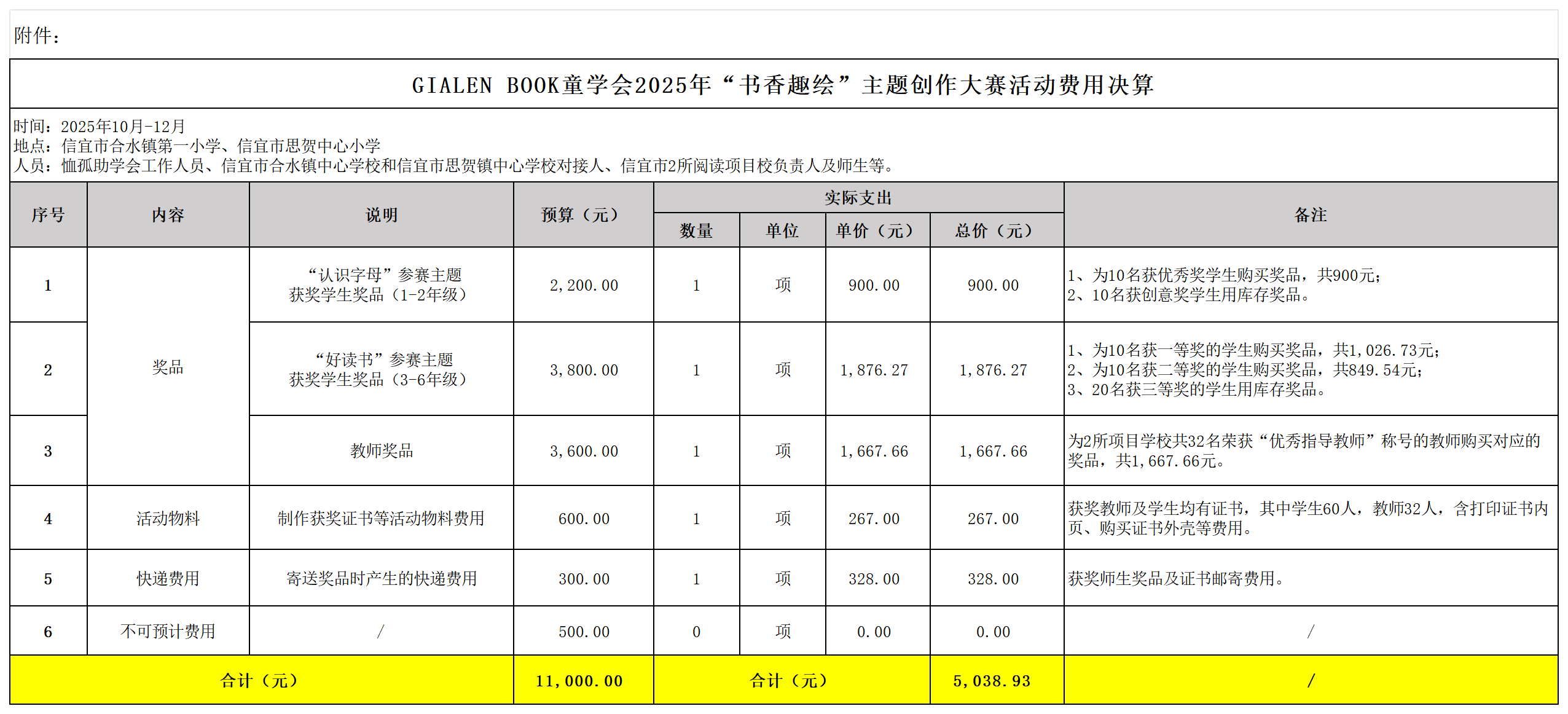 一、活动背景 2025年,广东公益恤孤助学促进会(以下简称本会)联合信宜市合水镇中心学校、信宜市思贺镇中心学校共同主办,在广州娇兰佳人化妆品连锁有限公司、广州星河创想文化发展有限公司支持下,于合水镇、思贺镇选点开展GIALEN BOOK童学会乡村儿童阅读服务项目(以下简称项目)。9月中旬,组织志愿者前往合水镇第一小学、思贺中心小学开展“好好”阅读包派发、阅读游园会及作家课堂等系列活动,为2所项目校学生派发2,197份阅读包及适龄的班级读物。 为鼓励学生继续保持阅读的热情,积累书中的知识,分享阅读感受,2025年10月至12月,在合水镇第一小学、思贺中心小学举办“书香趣绘”主题创作大赛,聚焦“认识字母”“好阅读”两个主题征集作品,最终共收到235份饱含童真与阅读感悟的创作。 二、参赛及表彰情况 10月29日至11月21日,主题创作大赛在各项目校陆续开展,共收集到235份创作作品。11月26日下午,本会邀请广东作家协会会员、美术专业志愿者组成评委团,对参赛作品开展首轮评选,最终选出188份作品进入网络投票评选阶段。 经过两轮的评选,本次大赛共有60份作品获得对应奖项。主题“认识字母”中,10份作品获优秀奖,10份作品获创意奖;主题“好阅读”中,10份作品获一等奖,10份作品获二等奖,20份作品获三等奖。与此同时,32名在大赛中悉心指导学生创作的教师,也获优秀指导教师称号。 12月中旬,本会根据评选结果,前往项目校为获奖师生颁发证书、奖品,具体如下: (一)主题“认识字母”获优秀奖学生:获得1张荣誉证书、1份中国传统国潮文化套装奖品。 (二)主题“认识字母”获创意奖学生:获得1张荣誉证书、1份3D模型城市立体拼图奖品。 (三)主题“好阅读”获一等奖学生:获得1张荣誉证书、1份熊猫皮箱文具套装奖品。 (四)主题“好阅读”获二等奖学生:获得1张荣誉证书、1份小熊密码箱文具套装奖品。 (五)主题“好阅读”获三等奖学生:获得1张荣誉证书、1份3D地标建筑模型拼图奖品。 (六)优秀指导教师:获得1张荣誉证书、1份办公用品礼盒奖品。 三、活动亮点 (一)激发学生阅读兴趣,促进师生更多地使用阅读资源。 此次主题创作大赛围绕“认识字母”与“好阅读”两个主题开展,为不同学段的项目校学生搭建一个自我展示的平台。1-2年的学生可依托班级读物英语绘本,发挥童真想象,设计兼具趣味性与知识性的英语字母书签;3-6年级的学生则借助“好好”阅读包内的三本书籍、班级读物“快乐读书吧”等阅读资源,将书中的故事、知识与感悟转化成可视化的创意手抄报。在本次主题创作大赛中,项目组共收到了项目校提交的235份创意作品,这些作品既凝聚孩子们对阅读的热爱和知识的思考,更实现了阅读资源的利用。 (二)促进师生交流,营造阅读氛围。 本次主题创作大赛除了为项目校学生搭建一个自我展示的平台外,还搭建起师生共读共创的互动桥梁。项目校教师作为引导者和陪伴者,和学生一起共读绘本、探索书中的世界。在指导书签设计、书写手抄报文字时,项目校教师深入了解学生们的阅读视角与感悟,引导学生们将所思所想融入作品中。活动以阅读与创作为纽带,不仅拉近了师生距离,更让校园洋溢着书香气息。 四、总结及建议 (一)优化参赛作品录入与归档流程,避免出现返工。 本次主题创作大赛共收集到235份创意作品,因考虑后续核查参赛作品信息及推进活动开展,故招募志愿者对第一轮入选的作品进行编号、扫描及命名等工作,以协助活动的顺利开展。由于是第一次尝试由志愿者负责参赛作品的录入与归档工作,根据执行过程中遇到的情况进行反思与总结,为后续活动开展提供优化建议。 建议如下: 1.提前确定志愿者招募时间及计划,明确需要协助的工作事项,便于志愿者短时间内清晰工作内容,顺利开展相关工作。 2.有针对性地招募志愿者,确保在有限时间内完成设定的志愿工作内容,避免出现返工。 (二)调整评审团评选和网络投票占比,更重视作品的质量。 本次主题创作大赛在进行网络投票阶段,接收到项目校部分师生的反馈,乡村学校大部分学生均是留守儿童,父母在外打工,无法抽出时间帮学生宣传作品、拉人投票;此外,仅由网络投票选出获奖作品结果比较片面化,缺乏信服力。 建议如下: 1.调整网络投票的占比,注重参赛作品的内容和质量。网络投票不作为最终获奖的唯一标准,降低网络投票结果在获奖中的占比率。 2.设置多元化的评选形式,提高获奖作品的公平性。后续可在活动中增设不同的评选方式,每个评选方式下对应获得不同的奖项。 致谢 本次“书香趣绘”主题创作大赛的开展,离不开各方的支持与付出。 诚挚感谢信宜市合水镇中心学校、思贺镇中心学校作为主办方支持项目、活动的顺利开展。 诚挚感谢合水镇第一小学、思贺中心小学作为承办方助力项目、活动的顺利开展。 诚挚感谢信宜市合水镇第一小学、思贺中心小学所有参与活动的师生,感谢你们用作品续写与阅读的故事。 诚挚感谢广州娇兰佳人化妆品连锁有限公司为项目、活动提供资金、资源支持。 诚挚感谢广东省作家协会会员李楚冰、广州星河创想文化发展有限公司龙思雨为活动提供专业技术支持。 诚挚感谢志愿者陈瑞玲、陈蔚青、简慧玲、陈亿凤、魏晓芳协助整理、录入活动的相关资料。 诚挚感谢每一位参与网络投票、积