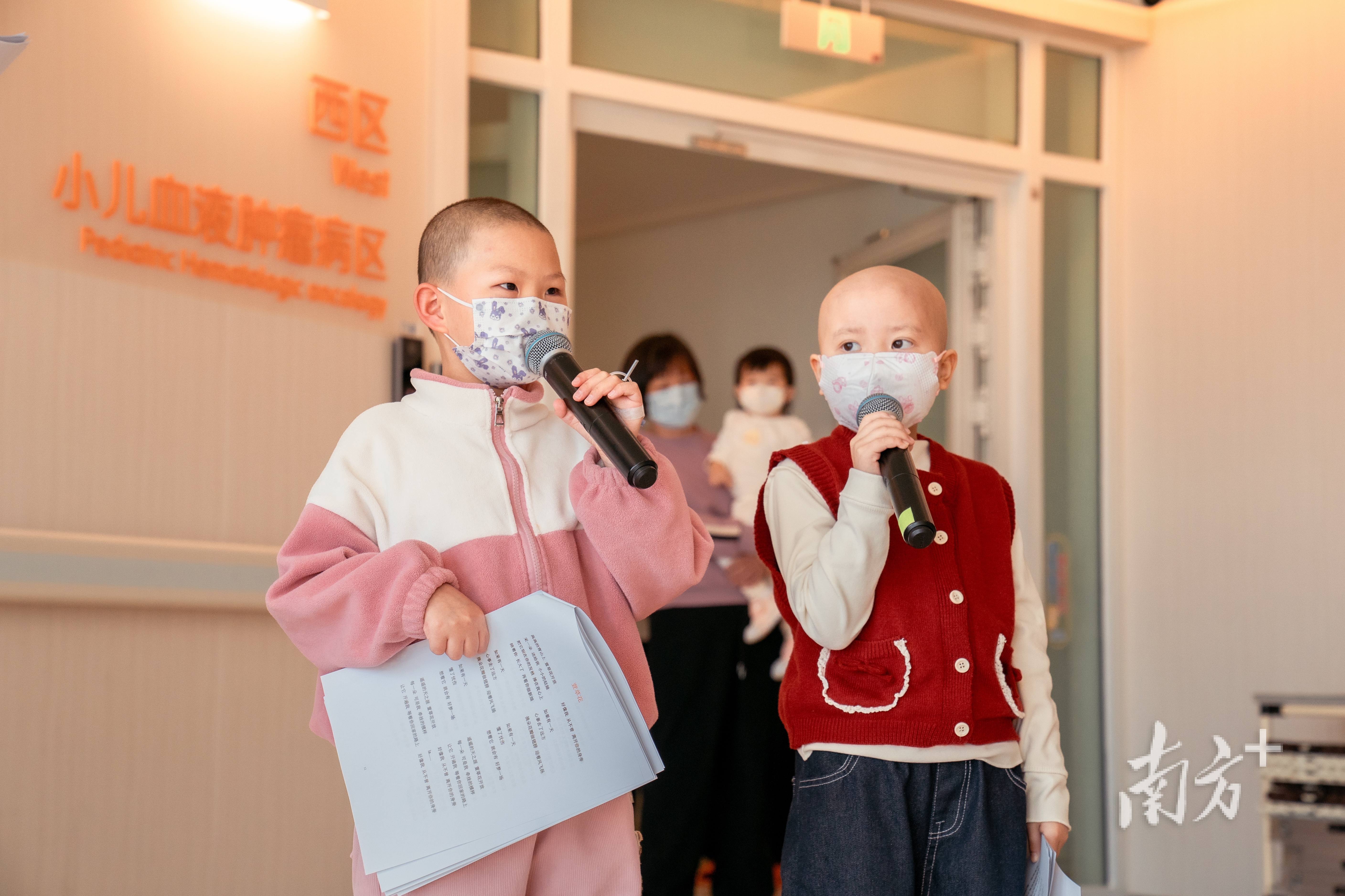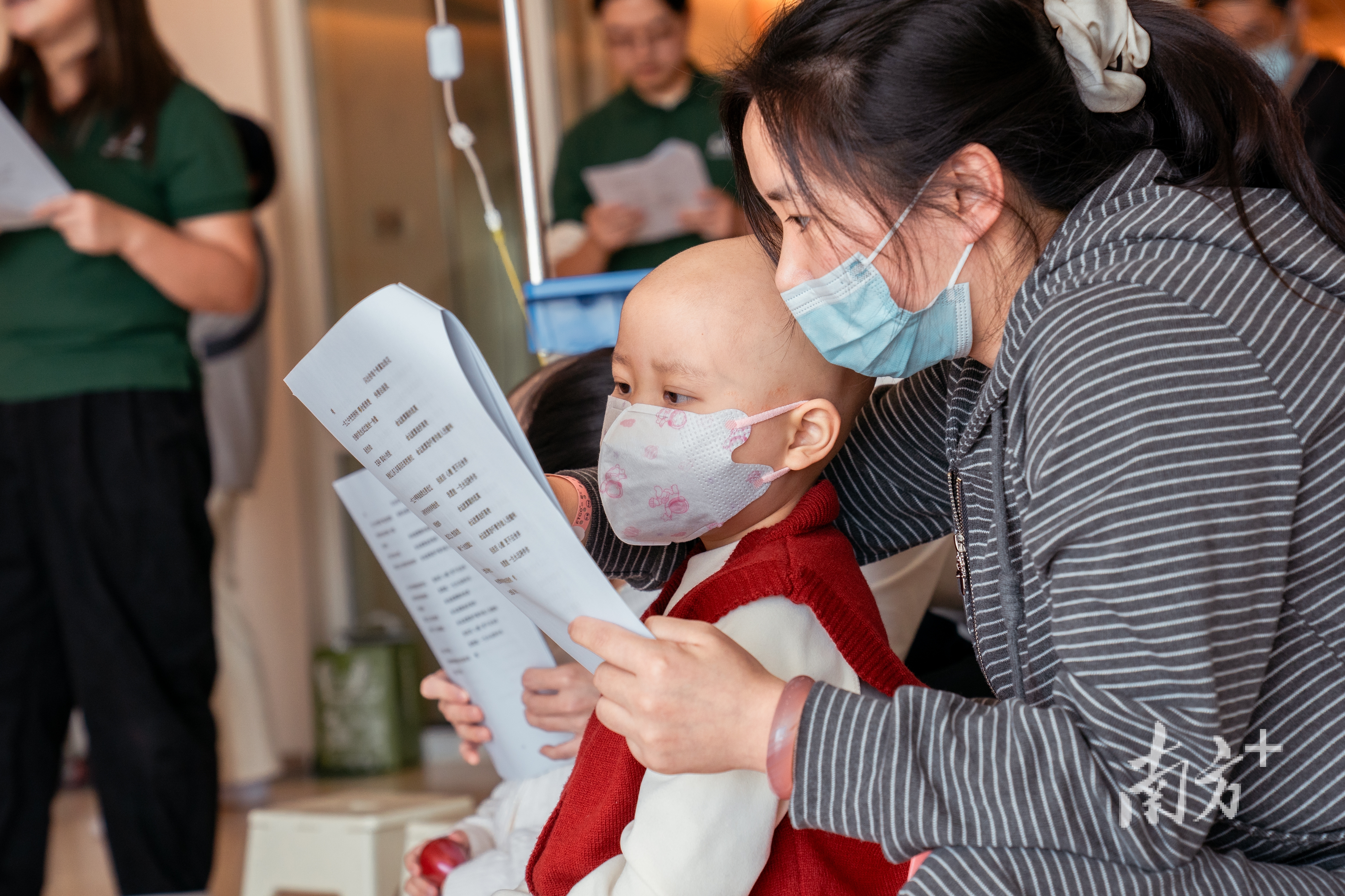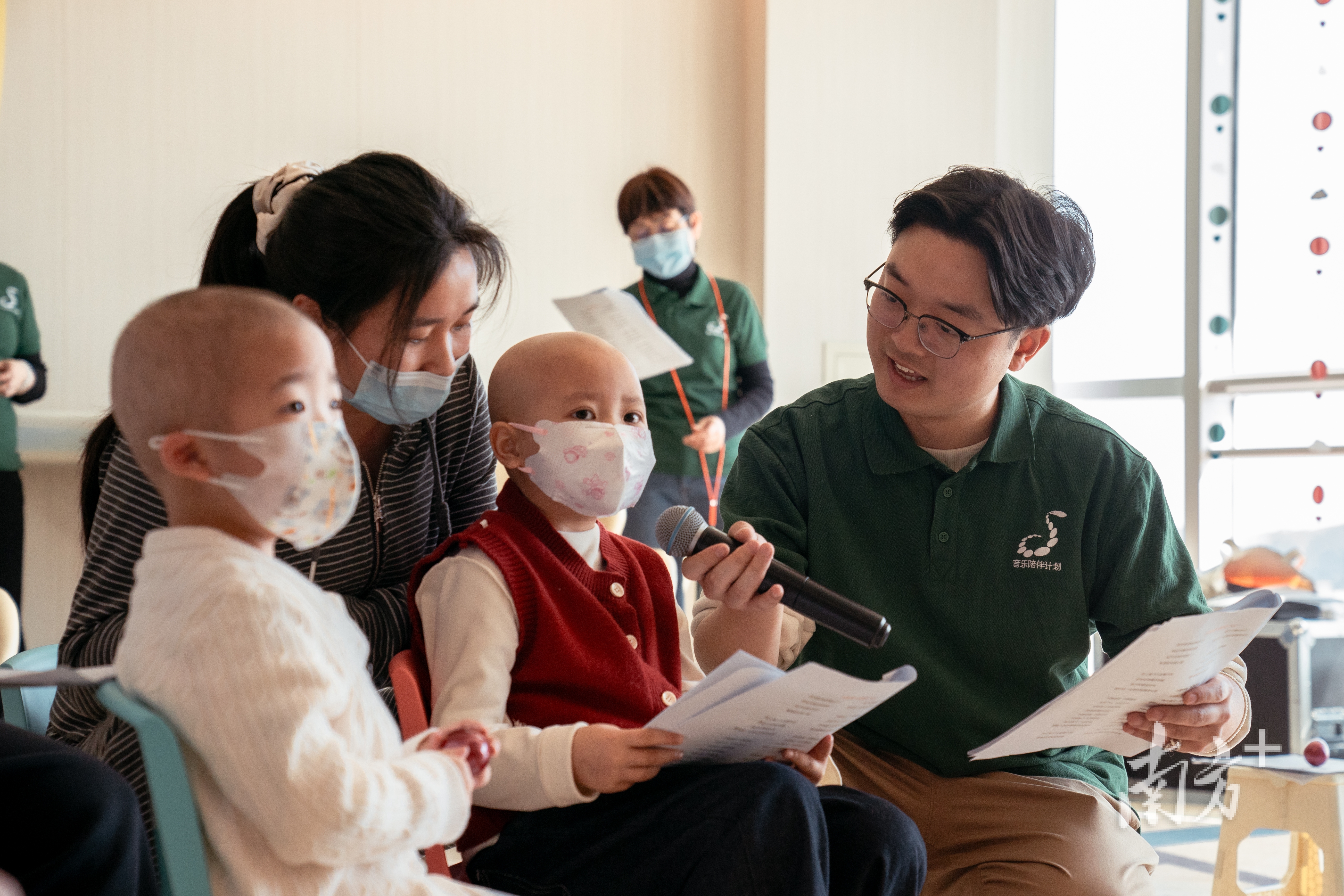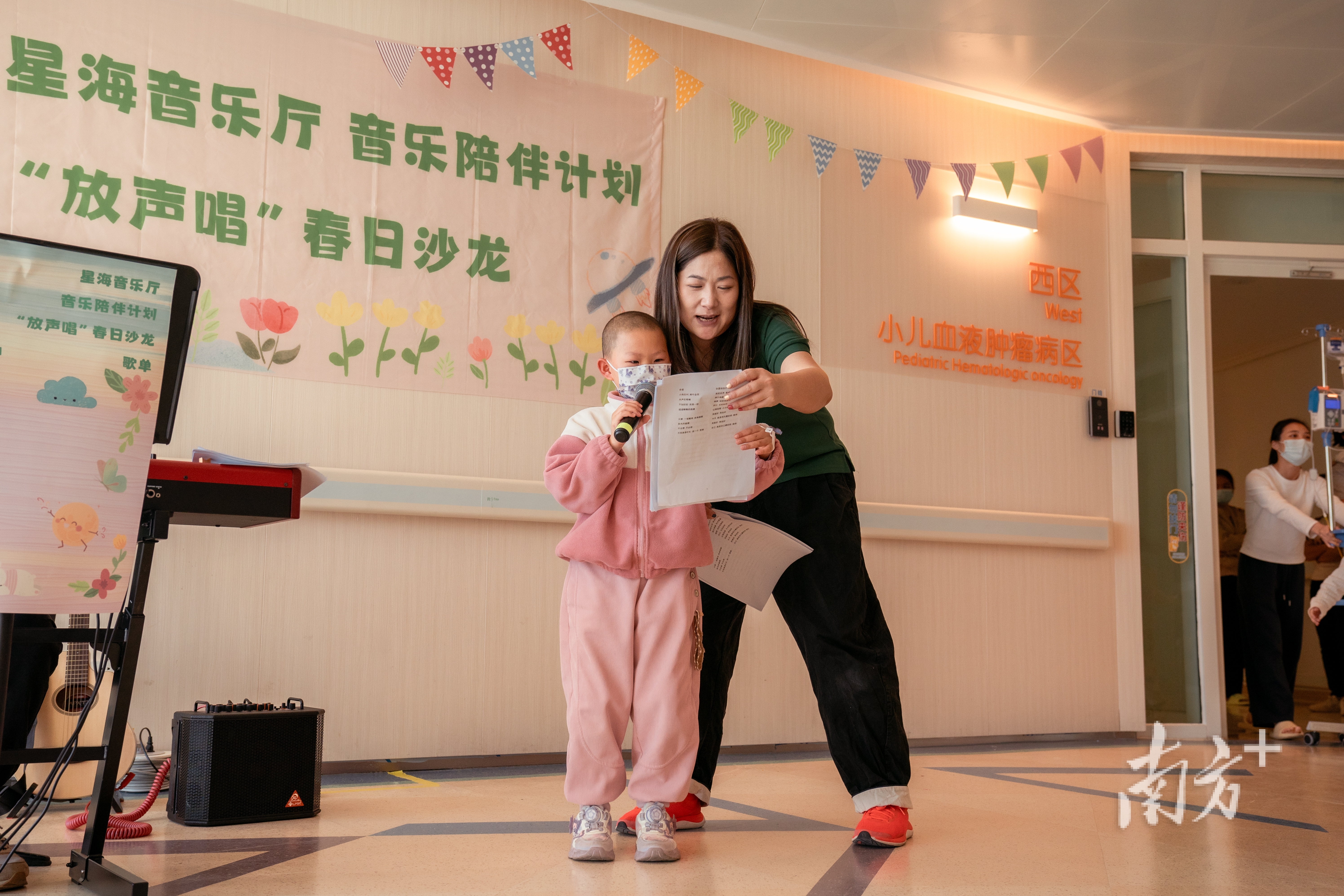随着孩子们和家长踊跃点唱,粤语歌、流行歌、儿歌等被轮流插入歌单,彭成霖老师现场伴奏,佳佳老师则负责气氛带动,妈妈一手抱孩子,一手拿麦大声歌唱,年轻的爸爸和女儿合唱周杰伦的歌曲,歌声接力不停,在病区公共区回荡,父母纷纷拿起手机拍下这一幕。