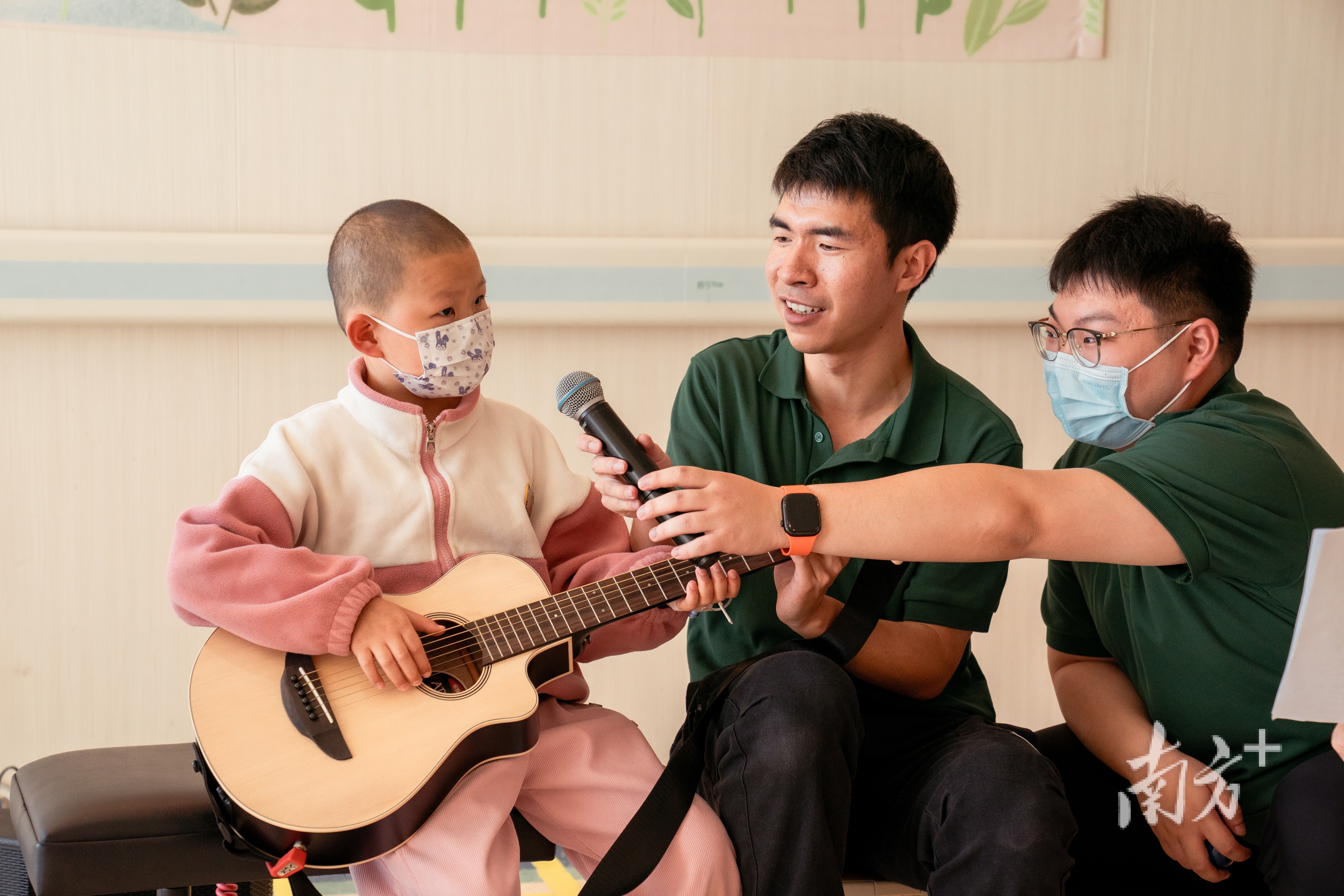 “黑黑的天空低垂,亮亮的繁星相随。”住院大楼内,一曲温柔的《虫儿飞》吉他弹唱缓缓响起,乐手老师按动和弦,患儿小范跃跃欲试地拨动着琴弦,透过音乐,默契的配合和信任在原本素昧平生的两人间迅速地建立起来,温暖的歌声让在场的每一位孩子、家长与医护人员为之动容。