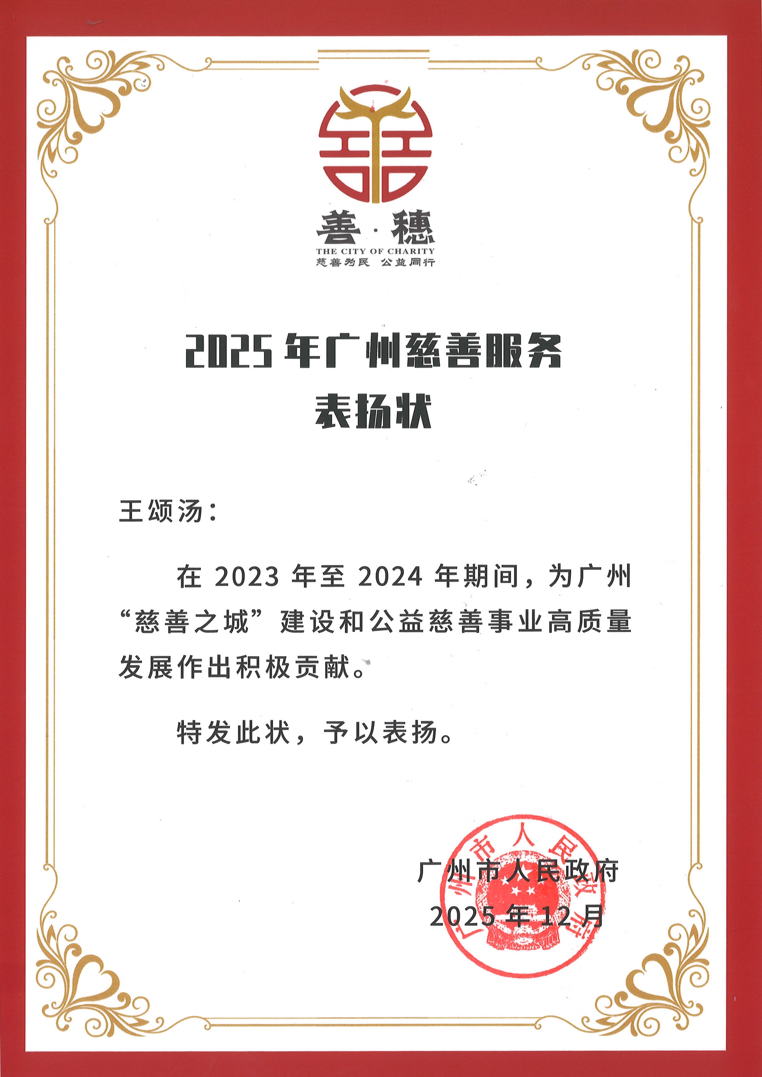 广东公益恤孤助学促进会及发起人王颂汤先生获2025年广州慈善服务表扬状