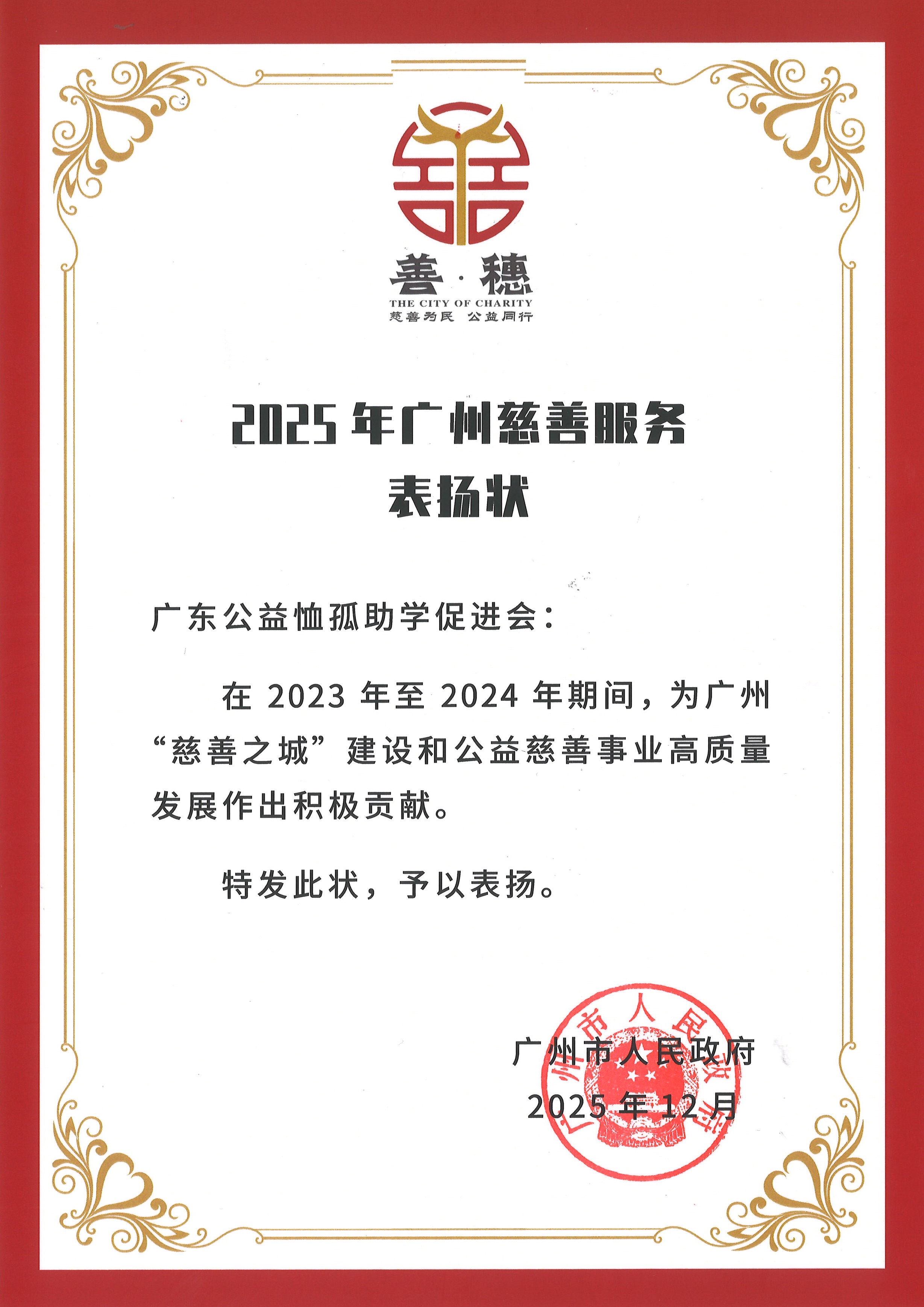 广东公益恤孤助学促进会及发起人王颂汤先生获2025年广州慈善服务表扬状