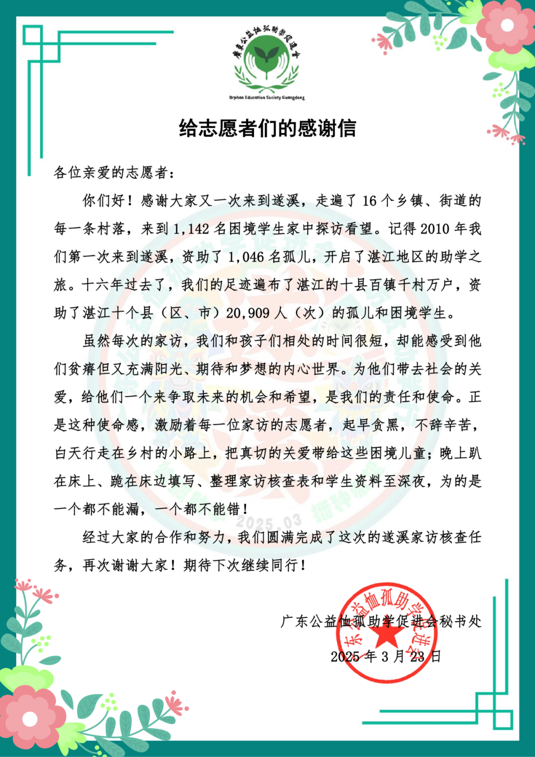 3月22、23日,在这个生机盎然、绿意萦绕的春天,恤孤助学会的159名志愿者、工作人员前往遂溪,对申请资助的1,142名困境学生开展第三期“访贫助学遂溪行”家访核查活动。 两天行程满满,在往返遂溪的大巴上、在遂溪各镇各村的乡间小路上、在饭桌旁、在酒店的房间里,都能看到一群绿衣志愿者认真工作的身影。感谢每一位志愿者的认真负责,我们顺利完成了这次家访核查工作。为此,恤孤助学会秘书处写下以下这封信,向关注、参与、支持这次家访工作的志愿者们表达诚挚的谢意。 “访贫助学行”项目已在慈善中国进行公开募捐备案,名称:恤孤助学行,备案编号:5144 0000 7583 4027 9KA2 1001。 本项目长期接受认捐,有意向对口资助遂溪县困境学生或了解项目相关信息,欢迎联系恤孤助学会资助业务部~联系电话:020-37657326、13822279353(微信同号)。 诚邀各位爱心伙伴扫描下图二维码,加入恤孤助学会已故老会长王颂汤生前发起的“恤孤助学行”一起捐,给困境学生实实在在的帮助,让学生们有一个争取未来的机会和希望。让我们携手传承王老会长的慈善精神,一起好事做好,将每一份爱心化作希望的种子,让爱与希望生生不息! 温馨提示:如对口资助学生,因腾讯公益平台仅显示捐赠人微信名,完成捐赠后,敬请在后台进行实名登记,或联系资助业务部告知捐款信息(见上文联系方式),以便核对和日后安排反馈学生资料。后台实名登记方式:在腾讯公益“我的”-“捐赠票据”进行公益事业捐赠专用收据开票申请。