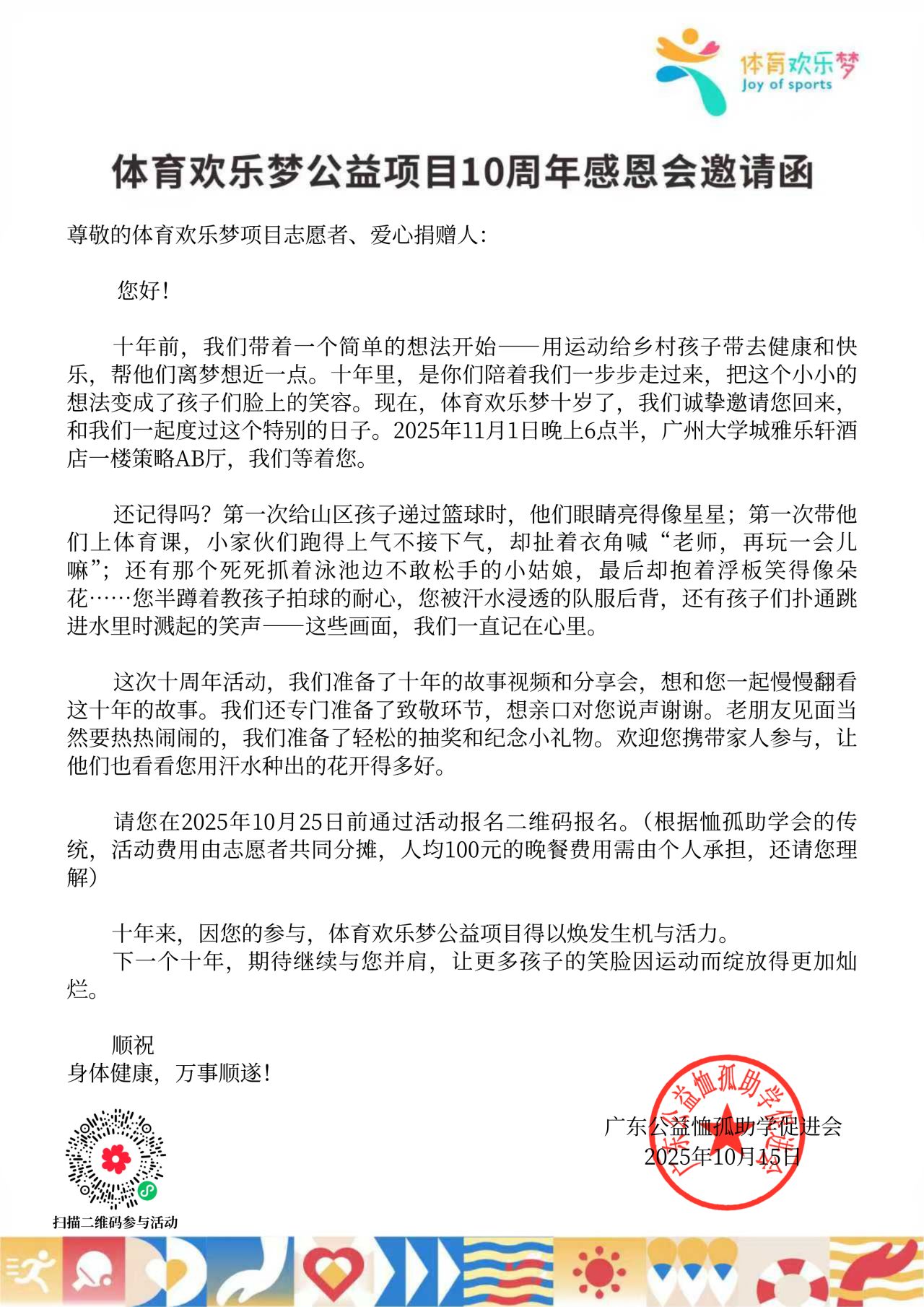 体育欢乐梦公益项目10周年感恩会邀请函 尊敬的体育欢乐梦项目志愿者、爱心捐赠人: 您好! 十年前,我们带着一个简单的想法开始——用运动给乡村孩子带去健康和快乐,帮他们离梦想近一点。十年里,是你们陪着我们一步步走过来,把这个小小的想法变成了孩子们脸上的笑容。现在,体育欢乐梦十岁了,我们诚挚邀请您回来,和我们一起度过这个特别的日子。2025年11月1日晚上6点半,广州大学城雅乐轩酒店一楼策略AB厅,我们等着您。 还记得吗?第一次给山区孩子递过篮球时,他们眼睛亮得像星星;第一次带他们上体育课,小家伙们跑得上气不接下气,却扯着衣角喊“老师,再玩一会儿嘛”;还有那个死死抓着泳池边不敢松手的小姑娘,最后却抱着浮板笑得像朵花……您半蹲着教孩子拍球的耐心,您被汗水浸透的队服后背,还有孩子们扑通跳进水里时溅起的笑声——这些画面,我们一直记在心里。 这次十周年活动,我们准备了十年的故事视频和分享会,想和您一起慢慢翻看这十年的故事。我们还专门准备了致敬环节,想亲口对您说声谢谢。老朋友见面当然要热热闹闹的,我们准备了轻松的抽奖和纪念小礼物。欢迎您携带家人参与,让他们也看看您用汗水种出的花开得多好。 请您在2025年10月25日前通过活动报名二维码报名。(根据恤孤助学会的传统,活动费用由志愿者共同分摊,人均100元的晚餐费用需由个人承担,还请您理解) 十年来,因您的参与,体育欢乐梦公益项目得以焕发生机与活力。 下一个十年,期待继续与您并肩,让更多孩子的笑脸因运动而绽放得更加灿烂。 顺祝 身体健康,万事顺遂! 广东公益恤孤助学促进会 2025年10月15日